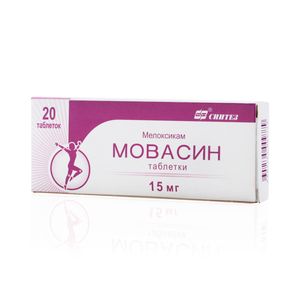 Показания к применениюСимптоматическая терапия: — остеоартроза; — ревматоидного артрита; — анкилозирующего спондилита (болезнь Бехтерева).Применение при беременности и кормлении грудьюПрепарат противопоказан при беременности и в период лактации (грудного вскармливания).;Применение Мовасина, как и других препаратов, блокирующих синтез простагландинов, может влиять на фертильность, поэтому не рекомендуется назначать женщинам, желающим забеременеть.Противопоказания— состояние после проведения аортокоронарного шунтирования; — декомпенсированная сердечная недостаточность; — полное или неполное сочетание бронхиальной астмы, рецидивирующего полипоза слизистой оболочки носа и околоносовых пазух и непереносимости ацетилсалициловой кислоты и других НПВП (в т.ч. в анамнезе); — эрозивно-язвенные изменения слизистой оболочки желудка или двенадцатиперстной кишки, активное желудочно-кишечное кровотечение; — воспалительные заболевания кишечника (язвенный колит, болезнь Крона); — цереброваскулярное кровотечение или иные кровотечения; — выраженная печеночная недостаточность или активное заболевание печени; — хроническая почечная недостаточность у больных, не подвергающихся диализу (КК менее 30 мл/мин), прогрессирующие заболевания почек (в т.ч. подтвержденная гиперкалиемия); — детский возраст до 12 лет (для таблеток); — детский возраст до 18 лет (для раствора для в/м введения); — беременность; — лактация (грудное вскармливание); — повышенная чувствительность к мелоксикаму и другим компонентам препарата.;В состав препарата в форме таблеток входит лактоза, поэтому пациенты с редкими наследственными заболеваниями, такими как непереносимость галактозы, дефицит лактазы или глюкозо-галактозная мальабсорбция, не должны принимать препарат.;С осторожностью;— ИБС; — цереброваскулярные заболевания; — компенсированная сердечная недостаточность; — дислипидемия/гиперлипидемия; — сахарный диабет; — заболевания периферических артерий; — курение; — КК 30-60 мл/мин; — анамнестические данные о развитии язвенного поражения ЖКТ; — наличие инфекции Нeliсobacter pуlori; — пожилой возраст; — длительное использование НПВП; — частое употребление алкоголя; — тяжелые соматические заболевания; — сопутствующая терапия следующими препаратами: антикоагулянты (например, варфарин); антиагреганты (например, ацетилсалициловая кислота, клопидогрел); пероральные ГКС (например, преднизолон); селективные ингибиторы обратного захвата серотонина (например, циталопрам, флуоксетин, пароксетин, сертралин).;Для снижения риска развития нежелательных явлений со стороны ЖКТ следует использовать минимальную эффективную дозу минимально возможным коротким курсом.СоставМелоксикам 15 мг;Вспомогательные вещества: повидон 12600 — 12 мг, лактозы моногидрат — 105 мг, кросповидон (коллидон CL-M) — 9 мг, крахмал картофельный — 2.5 мг, тальк — 9 мг, магния стеарат — 3 мг, целлюлоза микрокристаллическая — до 300 мг.