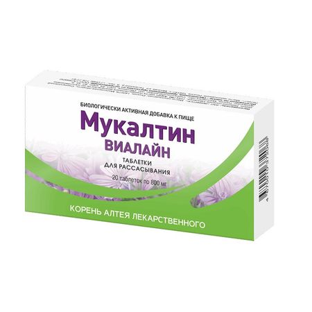 «МУКАЛТИН Виалайн® – таблетки для рассасывания на основе экстракта Алтея лекарственного. Алтей лекарственный — отхаркивающее и противовоспалительное средство при кашле с трудноотделяемой мокротой. Благодаря большому содержанию слизистых веществ (до 35%), которые обволакивают тонким слоем слизистую оболочку верхних дыхательных путей, экстракт алтея способствует смягчению сухого раздражающего кашля и облегчает откашливание; оказывает местное противовоспалительное действие. Витамин С принимает участие в следующих химических процессах организма человека: образование коллагена, серотонина из триптофана, образование катехоламинов, синтез кортикостероидов. Витамин С сам нейтрализует супероксидный радикал до перекиси водорода. Восстанавливает убихинон и витамин E. Стимулирует синтез интерферона, следовательно, участвует в иммуномодулировании. Переводит трёхвалентное железо в двухвалентное, тем самым способствует его всасыванию. Тормозит гликозилирование гемоглобина, тормозит превращение глюкозы в сорбит.»