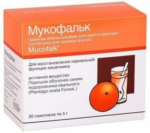 Показания к применениюЗапор (в т.ч. при беременности), анальные трещины, геморрой, послеоперационный период при вмешательствах в аноректальной области (в целях создания более мягкой консистенции стула), функциональная диарея, синдром раздраженного кишечника.Применение при беременности и кормлении грудьюОграничений и противопоказаний по приему препарата в период беременности и лактации нет.ПротивопоказанияПовышенная чувствительность к препарату, органические стриктуры желудочно-кишечного тракта, кишечная непроходимость, декомпенсированный сахарный диабет, детский возраст до 12 лет.Побочное действиеАллергические реакции.В первые дни лечения возможно усиление метеоризма и появление чувства переполнения в животе.Состав5 г гранул (1 пакетик или 1 чайная ложка) содержат:Активное вещество:Порошок оболочек семян подорожника овального (Plantago ovata Forssk.) — 3,25 гВспомогательные вещества: сахароза, декстрин, кислота лимонная, натрия альгинат, натрия цитрат, натрия хлорид, натрия сахаринат, ароматизатор апельсиновый.5 г гранул содержит количество усвояемых углеводов, соответствующих 0,064 хлебных единиц.Взаимодействие с другими препаратамиНе следует назначать одновременно с противодиарейными препаратами, а также с препаратами, угнетающими моторику кишечника.Следует соблюдать интервал в 30-60 минут между приемом Мукофалька и других препаратов.У больных с инсулинозависимым диабетом может потребоваться уменьшение дозы инсулина.