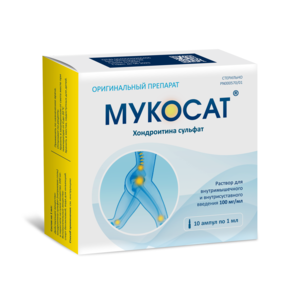 Показания к применениюМукосат назначают при лечении дегенеративно-дистрофических заболеваний позвоночника и суставов (при первичном артрозе, остеоартрозе с поражением крупных суставов, межпозвонковых остеоартрозах), при переломах, остеопорозах, пародонтопатиях. Мукосат эффективен в послеоперационном периоде пациентов, перенесших операции на суставах.Применение при беременности и кормлении грудьюВ настоящее время данные о применении препарата «Мукосат» в период беременности и кормления грудью, а также у детей отсутствуют.ПротивопоказанияПовышенная чувствительность к препарату.Склонность к кровоточивости.Тромбофлебиты.Побочное действиеВозможны аллергические реакции и геморрагии в месте инъекции (в этих случаях препарат отменяют).Состав1 мл раствора содержит:Активное вещество: хондроитина сульфат натрия 100 мг.Вспомогательные вещества: бензиловый спирт — 9 мг, вода д/и — до 1 мл.Взаимодействие с другими препаратамиС осторожностью следует назначать препарат Мукосат одновременно с антикоагулянтами прямого действия. Возможно так же усиление действия непрямых антикоагулянтов, антиагрегантов и фибринолитиков.