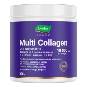 Мульти Коллаген Эвалар/Multi Collagen EvalarВнешний вид: порошок для приготовления напитка с шоколадным вкусом.В банке 225 г порошка, что составляет 15 порций по 15 г.Мульти Коллаген от Evalar Laboratory это мощный комплекс коллагена с высокоусвояемыми компонентами в высоких дозировках:? Коллаген — для активации процессов восстановления и омоложения организма изнутри;? Витамин С (в форме аскорбата кальция) — антиоксидантная защита; выработка собственного коллагена? Коэнзим Q10 (в форме убихинона) — для энергии и омоложения на клеточном уровне;? Метилсульфонилметан — для быстрого восстановления суставов и мышц, в том числе после тренировок.Состав коллагена от Evalar Laboratory уникален для российского рынка — БАД содержит одновременно 3 типа коллагена:? I, III тип — коллаген гидролизованный рыбный, усиленный витамином С и коэнзимом Q10.? II тип — нативный из глубоководного кальмара.? I, III тип — коллаген гидролизованный говяжий.Препарат обладает оптимальным аминокислотным составом и оказывает влияние на все ткани организма.Каждая порция коллагена содержит высокую дозировку — 10 000 мг — усиленного состава.Мульти Коллаген от Evalar Laboratory удобен в приёме: для приготовления полезного напитка необходимо всего 2 мерных ложки, которые можно растворить в воде или кофе.NO SUGAR — препарат содержит натуральный подсластитель — экстракт стевии из листьев Stevia Rebaudiana Bertoni.Стевия обладает высоким коэффициентом сладости, не увеличивает калорийность продукта, не повышает уровень сахара в крови.Напиток обладает приятным шоколадным вкусом и содержит натуральное какао.Показания к приему:• Антиоксидантная защита клеток• Восстановление суставов и связок• Улучшение состояния кожи, волос и ногтей• Предотвращение процессов старенияСодержание в 1 порции:Витамин С в форме аскорбата кальция — 180 мгКоэнзим Q10 — 30 мгМетилсульфонилметан — 300 мгПротеиновый Премиум-Комплекс с коллагеном: коллаген гидролизованный говяжий, коллаген гидролизованный рыбный, коллаген II типа нативный (из глубоководного кальмара) — 10 000 мг