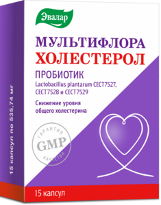 О вреде повышенного уровня холестерина знают практически все. Холестерин забивает наши сосуды, что в результате приводит к повышенному артериальному давлению, нестабильной работе сердца, риску развития атеросклероза… Однако мало кто знает о настоящей причине того, откуда берется лишний холестерин.Для правильной работы пищеварения из холестерина печень синтезирует желчные кислоты. Соли желчных кислот выделяются в кишечник около 6 раз в день. Часть из них впоследствии выводится из организма через кишечник, однако большая часть всасывается обратно и вновь попадает в печень. В результате печени не нужно расходовать холестерин для производства новых желчных кислот, и она использует те, которые вновь к ней вернулись. Что же происходит в таком случае? Излишки неиспользованного холестерина из печени попадают в кровь и откладываются на стенках сосудов, ухудшая кровоток, ослабляя сердце, провоцируя инфаркты и инсульты. Помочь вывести желчные кислоты из организма и не позволить им вернуться назад в печень – задача кишечных бактерий, таких, как Lactobacillus plantarum.Как работает Lactobacillus plantarumПробиотические штаммы Lactobacillus plantarum обладают уникальной способностью отделять от желчных кислот глицин и таурин. В результате этого свободные соли желчных кислот с большей легкостью выводятся из организма и не всасываются стенками кишечника. Благодаря этому процессу печень вынуждена снова начать работать и использовать имеющиеся запасы холестерина для образования новых желчных кислот, что приводит к снижению уровня общего холестерина и ЛПНП (липопротеидов низкой плотности) в плазме крови.Кроме того, пробиотические организмы способны снижать уровень еще одного «провокатора» развития атеросклероза – триглицеридов, чего не делают статины.Мультифлора Эвалар Холестерол – специально разработанный пробиотик, для снижения уровня общего холестерина. Он способствует снижению уровня липопротеидов низкой плотности (плохого холестерина), усилению действия статинов в целях снижения их дозировки.1 капсула Мультифлоры Холестерол содержит более 1 миллиарда (1,2 х 109) пробиотических организмов Lactobacillus plantarum специальных штаммов CECT7527, CECT7528, CECT7529.Мультифлора Холестерол содержит именно такие микроорганизмы, которые способны положительно влиять на уровень холестерина в крови.