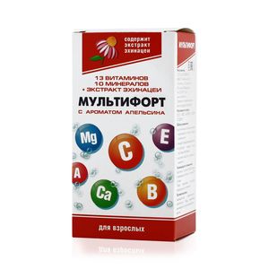 Витаминно-минеральный комплекс «Мультифорт» — сбалансированный комплекс из 13 витаминов, 10 минералов и растительного экстракта эхинацеи в шипучей таблетке.Отличительной особенностью витаминно-минерального комплекса «Мультифорт» является наличие органических композиций минеральных солей, которые снижают вероятность побочных действий, таких как аллергические реакции, тошнота, рвота, диарея.Витаминно-минеральный комплекс «Мультифорт» рекомендуется для защиты организма от простудных заболеваний, сокращения периода выздоровления после перенесенных заболеваний, и восстановления сил после болезни.Комбинированный витаминно-минеральный комплекс с экстрактом эхинацеи.Действие определяется свойствами витаминов и минералов, входящих в состав продукта:Витамин А повышает сопротивляемость организма к различным инфекциям.Витамин Е стимулирует и улучшает состояние иммунной системы.Витамин D помогает усвоению кальция и фосфора, необходим для формирования костно-суставной системы.Витамин К нормализует процесс свертывания крови. Повышает прочность стенок сосудов.Витамин В1 защищает организм от умственных переутомлений, улучшает память, в комплексе с другими витаминами группы В повышает сопротивляемость организма к инфекциям и простудам.Витамин В2 защищает нервную систему от стрессов и переутомлений.Витамин В6 усиливает и поддерживает естественную защиту организма от инфекций.Витамин В12 влияет на умственную деятельность, формирует положительные эмоции.Витамин С повышает сопротивляемость организма к различным инфекциям, иммуностимулятор организма.Фолиевая кислота укрепляет нервную систему, способствует нормальному кроветворению.Ниацин очищает кровеносные сосуды от липопротеидов, уменьшает риск развития сердечно-сосудистых заболеваний.Биотин необходим для функционирования нервной системы.Пантотенат кальция повышает барьерные свойства слизистых оболочек, защищая от инфекций, стимулирует работу мозга, снимает рассеянность, забывчивость и легкие депрессивные расстройства.Кальций повышает сопротивляемость организма, регулирует сердечно-сосудистую деятельность, необходим для минерализации костной ткани.Магний питает нервные клетки, снижает утомляемость, раздражительность, нормализует сон.Цинк усиливает защитную реакцию организма.Калий повышает физическую выносливость, предотвращает утомление, снижает риск развития синдрома хронической усталости.Марганец влияет на развитие костной ткани, участвует в тканевом дыхании, иммунных реакциях.Медь увеличивает сопротивляемость организма к инфекциям, способствует защите организма от вредных факторов окружающей среды.Йод повышает физическую работоспособность, улучшает умственные возможности, предотвращает утомляемость, улучшает нервно-психическое развитие, стабилизирует эмоциональный фон, устраняет раздражительность.Селен защищает клетки и ткани организма от воздействия неблагоприятных факторов внешней среды.Хром снижает уровень «плохого» холестерина в крови, предотвращает развитие атеросклероза и сердечно-сосудистых заболеваний.Молибден способствует предотвращению разрушения зубов, участвует в белковом, углеводном, жировом обменах.Эхинацея является природным иммуномодулятором, повышает сопротивляемость организма к инфекционным и про