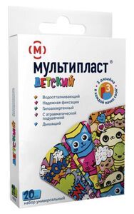 В набор бактерицидных детских пластырей входит 20 пластырей трех типоразмеров, специально подобранных под наиболее типичные детские проблемы: царапины на пальце, порез или ссадина на колене. Яркие рисунки и красочная графика не только привлекают внимание детей, но и отвлекают от грустных мыслей о царапинах. Бактерицидный пластырь на полиэтиленовой перфорированной пленке с подушечкой, пропитанной: хлоргексидином биглюконат.Ключевые характеристики: Водоотталкивающий Надежная фиксация Гипоалергенный С атравматической подушечкой Дышащий Три дизайнаАссортимент пластырей Мультипласт® детский представлен: универсальный набор №20 (1.9×7.2 см -10 шт. 1.6×5.7 см-4 шт. 3.8×3.8 см– 6 шт.)Лейкопластырь представляет собой комбинированное изделие прямоугольной формы различных размеров, включающее: фиксирующую часть в виде подложки (основы) из перфорированной полиэтиленовой пленки с липким клеевым слоем, подушечку из нетканого полотна, пропитанную антисептиком хлоргексидином (хлоргексидина биглюконатом), защитное покрытие из материала антиадгезионного или бумаги силиконизированной.Описание принципа действия:Неинвазивное сцепление с поверхностью кожи с целью фиксации подушечки, пропитанной антисептиком, на поврежденных участках кожи, их дезинфекции и ускорения заживления.