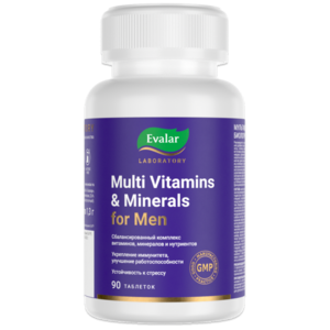 Инновационный комплекс с биоактивными компонентами для мужского здоровья от Evalar Laboratory рекомендован к приему в качестве биологически активной добавки для восполнения дефицита витаминов и минералов. В составе мультивитаминного комплекса для мужчин от Evalar Laboratory используются особые легко усваиваемые формы привычных нам витаминов и минералов: А, С, D3, Е, В1, В2, В6, В12, ниацин, фолиевая кислота, биотин, пантотеновая кислота, кальций, магний, цинк, медь, марганец, йод, селен, хром, молибден. Формула усилена натуральными растительными компонентами, которые положительно влияют на мужской организм. Среди них – экстракты пантов марала, пальмы сабаль, корня эурикомы длиннолистной, женьшеня и зеленого чая. Особый метод обработки растений помогает нам сохранить всю силу природы для вашего здоровья. Для производства наших препаратов мы используем современные технологии производства, которые позволяют сохранить первозданную силу природных ингредиентов, и получать продукты с максимальной биологической активностью.В состав витаминно-минерального комплекса для мужчин от Evalar Laboratory входят:Биодоступные формы витаминов в составе: В12 – метилкобаламин, витамин К2 – менахинон-7.Легкодоступные хелатные формы минералов: кальция, магния, цинка, меди, марганца.Органический йод в форме легко усваиваемого йодказеина.Уникальный набор натуральных растительных экстрактов эффективных для мужского здоровья: пальмы сабаль, зеленого чая, эурикомы, пантов марала, женьшеня.В нашем витаминном комплексе мы используем растительные компоненты в форме высокоактивных экстрактов, а не в привычном измельченном виде.Экстракты пантов марала, пальмы сабаль, корня эурикомы длиннолистной перерабатываются на инновационном европейском оборудовании и сохраняют свою высокую природную биологическую активность.