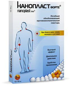 НАНОПЛАСТ ФОРТЕ (NANOPLAST forte) — лечебный обезболивающий противовоспалительный пластырь — изделие медицинского назначенияДанный пластырь изготовлен на основе современных нанотехнологий, достижений традиционной и народной медицин.НАНОПЛАСТ форте® — сила науки против боли!Лечебный пластырь НАНОПЛАСТ форте® размер 12х18см использует магнитные и инфракрасные волны для борьбы с болью в шее, спине и суставах в том числе у людей крупного телосложения.Пластырь обладает обезболивающим, противовоспалительным и мышечно-расслабляющим действиями, способствует восстановлению функции опорно-двигательного аппарата (суставов, мышц и связок), а также более быстрому восстановлению и уменьшению последствий закрытых травм мягких тканей, опорно-двигательного аппарата (ушибов, растяжений связок и мышц, вывихов суставов, кровоподтеков и кожных гематом и т. д.).Сочетанное воздействие инфракрасного (теплового) излучения и магнитного поля приводит к улучшению местного (локального) крово- и лимфообращения, уменьшению застоя крови и улучшению венозного оттока, уменьшению воспалительной реакции: отека, боли.Улучшает местный метаболизм, расслабляет мышцы и связки.Способствует восстановлению функции опорно-двигательного аппарата, уменьшению гематом и кровоподтеков при травмах мягких тканей и суставов.Лечебный обезболивающий противовоспалительный пластырь НАНОПЛАСТ форте — это новый стандарт лечения заболеваний опорно-двигательного аппарата.Прошедший детальные клинические исследования на основе доказательной медицины, лечебный пластырь НАНОПЛАСТ форте показал свою высокую эффективность и безопасность как для купирования острых состояний, так и для курсовой терапии различных заболеваний суставов, позвоночника, мышц и связок.Пластырь НАНОПЛАСТ форте представляет собой тонкую гибкую пластину, изготовленную на основе смеси мелкодисперсного порошка из редкоземельных магнитных материалов, уникального нанопорошка — продуцитора инфракрасного излучения и гипоаллергенного полимерного материала. Пластина нанесена на клейкую основу телесного цвета и закрыта защитным бумажным слоем, который перед употреблением необходимо удалить.Лечебный обезболивающий противовоспалительный пластырь НАНОПЛАСТ форте производится по уникальной технологии, основанной на технологии производства магнитопластов.ПРИНЦИП ДЕЙСТВИЯЛечебный эффект пластыря НАНОПЛАСТ форте основан на одновременном действии на очаг воспаления глубокого мягкого тепла в сочетании с магнитотерапевтическим воздействием постоянного магнитного поля.Нанопорошок — продуцитор инфракрасного излучения активизируется при нагревании до температуры тела и обеспечивает длительное, мягкое и глубокое тепловое воздействие на очаг воспаления.Порошок из редкоземельных магнитных материалов воздействует на очаг поражения слабым постоянным магнитным полем.Это сочетание приводит к ускорению крово- и лимфообращения, уменьшению застоя крови, улучшению венозного оттока, улучшает местный метаболизм в очаге воспаления. В результате обеспечивается обезболивающий и противовоспалительный эффект препарата, ускоряется процесс естественного выздоровления пораженной области.Пластырь НАНОПЛАСТ форте расслабляет мышцы и связки, способствует уменьшению отеков, восстановлению функции 