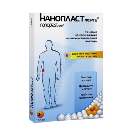 НАНОПЛАСТ ФОРТЕ (NANOPLAST forte) — лечебный обезболивающий противовоспалительный пластырь — изделие медицинского назначения Данный пластырь изготовлен на основе современных нанотехнологий, достижений традиционной и народной медицин. НАНОПЛАСТ форте® — сила науки против боли! Лечебный пластырь НАНОПЛАСТ форте® размер 12х18см использует магнитные и инфракрасные волны для борьбы с болью в шее, спине и суставах в том числе у людей крупного телосложения. Пластырь обладает обезболивающим, противовоспалительным и мышечно-расслабляющим действиями, способствует восстановлению функции опорно-двигательного аппарата (суставов, мышц и связок), а также более быстрому восстановлению и уменьшению последствий закрытых травм мягких тканей, опорно-двигательного аппарата (ушибов, растяжений связок и мышц, вывихов суставов, кровоподтеков и кожных гематом и т. д.). Сочетанное воздействие инфракрасного (теплового) излучения и магнитного поля приводит к улучшению местного (локального) крово- и лимфообращения, уменьшению застоя крови и улучшению венозного оттока, уменьшению воспалительной реакции: отека, боли. Улучшает местный метаболизм, расслабляет мышцы и связки. Способствует восстановлению функции опорно-двигательного аппарата, уменьшению гематом и кровоподтеков при травмах мягких тканей и суставов. Лечебный обезболивающий противовоспалительный пластырь НАНОПЛАСТ форте — это новый стандарт лечения заболеваний опорно-двигательного аппарата. Прошедший детальные клинические исследования на основе доказательной медицины, лечебный пластырь НАНОПЛАСТ форте показал свою высокую эффективность и безопасность как для купирования острых состояний, так и для курсовой терапии различных заболеваний суставов, позвоночника, мышц и связок. Пластырь НАНОПЛАСТ форте представляет собой тонкую гибкую пластину, изготовленную на основе смеси мелкодисперсного порошка из редкоземельных магнитных материалов, уникального нанопорошка — продуцитора инфракрасного излучения и гипоаллергенного полимерного материала. Пластина нанесена на клейкую основу телесного цвета и закрыта защитным бумажным слоем, который перед употреблением необходимо удалить. Лечебный обезболивающий противовоспалительный пластырь НАНОПЛАСТ форте производится по уникальной технологии, основанной на технологии производства магнитопластов. ПРИНЦИП ДЕЙСТВИЯ Лечебный эффект пластыря НАНОПЛАСТ форте основан на одновременном действии на очаг воспаления глубокого мягкого тепла в сочетании с магнитотерапевтическим воздействием постоянного магнитного поля. Нанопорошок — продуцитор инфракрасного излучения активизируется при нагревании до температуры тела и обеспечивает длительное, мягкое и глубокое тепловое воздействие на очаг воспаления. Порошок из редкоземельных магнитных материалов воздействует на очаг поражения слабым постоянным магнитным полем. Это сочетание приводит к ускорению крово- и лимфообращения, уменьшению застоя крови, улучшению венозного оттока, улучшает местный метаболизм в очаге воспаления. В результате обеспечивается обезболивающий и противовоспалительный эффект препарата, ускоряется процесс естественного выздоровления пораженной области. Пластырь НАНОПЛАСТ форте расслабляет мышцы и связки, способствует уменьшению отеков, восстановлени