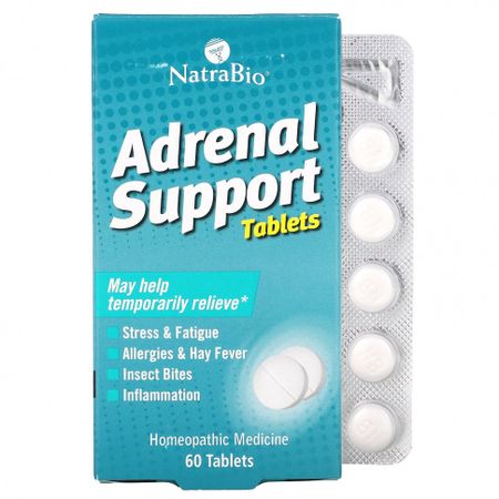 Состав и назначение Активные ингредиенты Назначение Adrenalinam 6X, 12X, 30X надпочечниковая функция Berberis vulgaris 6X, 12X надпочечниковая функция Argentum Nitricum 10X истощение, энергия Natrum Muriaticum 10X функция надпочечников, обмен веществ Ванадий 10X надпочечниковая функция, энергия Oleum Morrhuae 12X надпочечниковая функция, энергия Нефть 12X функция надпочечников, обмен веществ Неактивные ингредиенты: целлюлоза, лактоза, декстроза, стеарат магния Натуральная медицинаУлучшенная формулаНе вызывает сонливостиНе вызывает привыканияУдобные быстрорастворимые таблеткиМожет временно облегчить такие симптомы:стресс и усталостьаллергия на пыльцу, поллинозукусы насекомыхвоспаление переутомлениеКомпания NatraBio® занимается выпуском инновационных продуктов для здоровья, которые разрабатываются и производятся в соответствии с фармацевтическими стандартами.На протяжении более 35 лет компания NatraBio® остается лидером в области инноваций и исследований натуральных препаратов, уделяя особое внимание качеству продукции и удовлетворенности покупателей.
