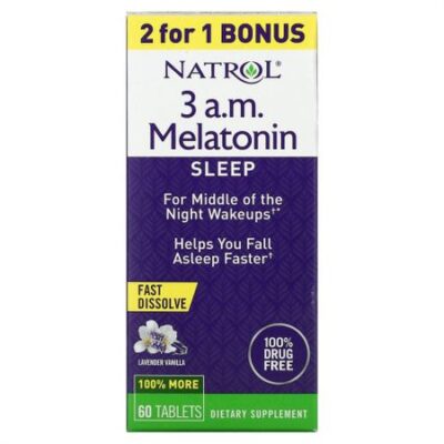 Пищевая ценностьРазмер порции: 1 таблеткаПорций в упаковке: 60 Количество в 1 порции% от суточной нормыL-теанин50 мг *Мелатонин 3 мг * * Суточная норма не определена. Помогает быстрее заснутьБыстро растворяетсяНе содержит наркотических веществНа 100% большеПищевая добавкаНе вызывает привыканияБез сахараБез ГМОВегетарианский продуктБез искусственных красителей, ароматизаторов и подсластителейБренд № 1 мелатонина ^Для пробуждения посреди ночиИногда просыпаться среди ночи может быть кошмаром. Natrol® 3 часа ночи Благодаря мелатонину беспокойные ночи остались в прошлом *.Принимайте, когда просыпаетесь ночьюПринимать Natrol®в 3 часа ночи. Мелатонин находится рядом, поэтому в следующий раз, когда вы проснетесь, вы можете взять растворяющую таблетку, которую легко принять, чтобы заснуть и проснуться отдохнувшим.Мелатонин. Помогает направлять циклы сна и бодрствования.L-теанин: Аминокислота природного происхождения, успокаивающая.Быстро растворяющаяся форма: Можно разжевать или растворить во рту без воды.* Мелатонин — это средство от эпизодической бессонницы.^ Nielsen xAOC, 52 недели, закончившиеся 05.09.2020 г.