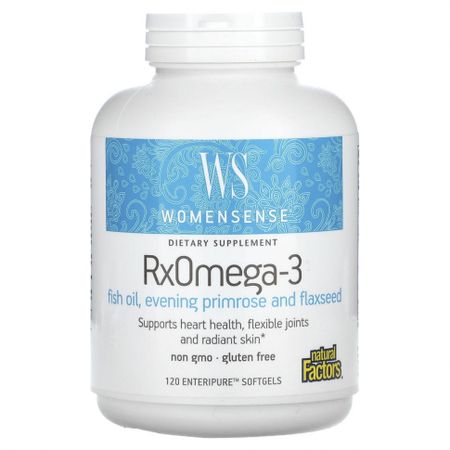 Пищевая добавкаРыбий жир, примула вечерняя и семена льнаПоддерживает здоровье сердца, гибкость суставов и сияние кожиНе содержит глютенаЧистота и эффективность гарантированыWomenSense — это серия продуктов для женщин, предназначенная для поддержки здоровья на самом высоком уровне.WomenSense RxOmega-3 естественным образом поддерживает здоровье сердца, гибкость суставов и сияние кожи. RxOmega-3 — это рыбий жир фармацевтического класса, содержащий высокоэффективные ЭПК и ДГК. Продукт дистиллированный на молекулярном уровне с гарантией чистоты и защиты от веществ, загрязняющих окружающую среду, таких как ПХД, ртуть или другие вредные соединения. RxOmega-3 превосходит самые строгие международные стандарты качества.Одна порция (2 мягкие таблетки) содержит 400 мг ЭПК и 200 мг ДГК омега-3 жирных кислот, а также 260 мг мощного антиоксиданта АЛК и 50 мг ГЛК, основного компонента, необходимого для здоровой, сияющей кожи.Мягкие таблетки WomenSense RxOmega-3 Enteripure™ действуют направленно благодаря технологии, защищающей чистые и натуральные ингредиенты внутри таблетки и предотвращающей их распад в желудке (благодаря чему отсутствует рыбное послевкусие).Сертификат Isura
