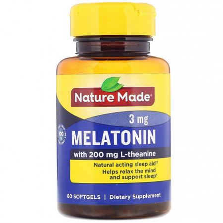 Дополнительные факты Размер порции: 1 softgel Количество на Softgel % Дневная стоимость Калории 5 L-теанин 200 мг * мелатонин 3 мг * * Суточная доза не определена. Не содержит наркотических веществСодержит 200 мг L-теанинаСредство для облегчения сна естественного действия ‡Помогает расслабить разум и улучшить сонБиологически активная добавкаБез синтетических красителей — красители получены из натуральных источников Без искусственных ароматизаторовБез глютена‡ Содержит мелатонин, натуральный гормон, содержащийся в организме.