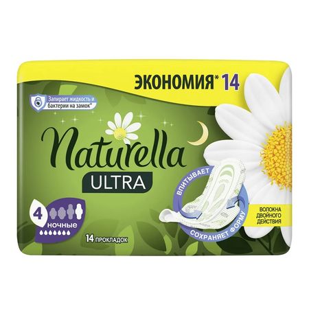 Впитываемость: 7 кап (из 7) В период менструации ваша кожа должна ощущать комфорт, а вы — продолжать чувствовать себя красивой. Мы убеждены, что, подобно цветку во время дождя, ваша кожа в период менструации становится уязвимой и нуждается в сверхнежной защите. Мягкие гигиенические прокладки Naturella Ultra Night Ромашка с крылышками, помогающими надежно фиксировать прокладку, обеспечивают защиту кожи в интимной зоне в ночное время при обильных выделениях. Это единственные женские прокладки, содержащие Dermacrem — уникальный сухой лосьон против раздражения кожи, действие которого доказано клинически. Гигиенические прокладки Naturella Ultra Night толщиной 2 мм имеют аромат ромашки и желобки в форме цветка с эксклюзивной впитывающей системой, а превосходно впитывающие гелевые шарики помогают распределять и удерживать жидкость внутри, обеспечивая сухость и комфорт в течение всей ночи. Прокладки Naturella обеспечивают дополнительную защиту, необходимую во время менструации, бережно заботясь о вашей коже в ночное время. Менструация может быть сопряжена с некоторыми проблемами, и в это время средства защиты не должны быть еще одним источником дискомфорта. Для ежедневной защиты и свежести воспользуйтесь ежедневными прокладками Naturella. Преимущества:- Заботятся о вашей коже, одобрены дерматологами- Более длинная задняя часть (по сравнению с прокладками Naturella Ultra Normal и Maxi) для дополнительной защиты при обильных выделениях в ночное время- Гигиенические прокладки обеспечивают защиту и заботятся о самой деликатной коже- Содержат успокаивающий лосьон Dermacrem, который покрывает кожу тонким защитным слоем и предотвращает раздражение- Необычайно мягкий верхний слой с эксклюзивной впитывающей системой для защиты от протеканий- Гигиенические прокладки с легким ароматом ромашки помогают справиться с неприятным запахом во время менструации- Толщина 2 мм для комфорта и свободы движений- Гигиенические прокладки в индивидуальной упаковке для удобства защиты и ухода в дороге