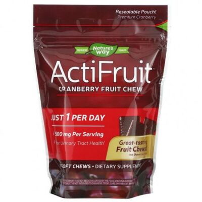 ** Суточная норма не определена. Упаковка многоразового использованияКлюква премиального качестваКомпания основана в 1969 году1 жевательная таблетка в день500 мг в 1 порцииЗдоровье мочевыводящих путейОтличные фруктовые вкусы!Пищевая добавкаПолучите максимум пользы от клюквы ActiFruit производится из цельных фруктов, а в других продуктах используется только сок Вегетарианский продукт Без глютенаЧто такое PAC?Проантоцианидины (PAC) — это группа флавоноидов, содержащихся во фруктах и семенах, которые обеспечивают защитные свойства. Но не все виды проантоцианидинов поддерживают здоровье мочевыводящих путей. Наиболее полезны для них проантоцианидины типа А из клюквы.Клюква содержит проантоцианидины типа A (PAC), которые являются ее ключевыми активными веществами, поддерживающими здоровье мочевыводящих путей.ActiFruit стандартизирован из уникальных сортов клюквы, в том числе Эрли Блэк (Early Black), для которых характерна более высокая природная активность проантоцианидинов.