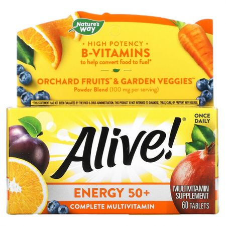 черника, апельсин, морковь, гранат, слива, клубника, яблоко, свекла, вишня, груша, томат, цветная капуста, малина, асаи, спаржа, банан, брокколи, брюссельская капуста, кочанная капуста, клюква, огурец, виноград, горох, ананас, тыква, шпинат100 мг**Ресвератрол (из экстракта корня Горца японского)900 мкг**Ликопин300 мкг**Лютеин (из экстракта цветков Бархатцев прямостоячих)250 мкг**Бор (в виде бората натрия)150 мкг**** Суточная норма не определена. Высокоэффективные витамины группы B, которые помогают превращать пищу в энергиюПорошковые смеси из фруктов и овощей Orchard Fruits™ и Garden Veggies™ (100 мг в 1 порции)Прием один раз в деньМультивитаминная добавка Не содержит кофеина17 незаменимых витаминов и минералов Обеспечивает 100% или более от суточной нормы Мультивитамины Alive!® дарят вам заряд энергии, чтобы вы могли заниматься тем, что имеет для вас важное значение! Получите максимум пользы от мультивитаминов, в состав которых входят мощные витамины, минералы и пищевые смеси. Проживайте каждый день активно — вместе с Alive!Рекомендуется принимать женщинам старше 50 лет в качестве поддержки:здоровья сердца,прочности костей,заряда энергии на клеточном уровне,иммунитета,здорового зрения.Получите максимум пользы от мультивитаминов!Здоровое зрениеБета-каротин (витамин A)Витамины C и EЛютеин и цинкПрочные костиКальций и фолатМагний и марганецВитамины D3 и К Здоровое сердцеВитамины группы BВитамины C и EУкрепление иммунитетаСелен и цинкВитамины A, C и D3заряда энергии на клеточном уровне,Витамины группы B, магний и биотин Здоровая кожаВитамины A, C, E и цинк