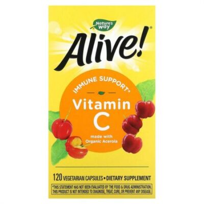 Пищевая ценностьРазмер порции: 4 капсулыПорций в упаковке: 30 Количество в 1 порции% от суточной нормыВитамин C (из органической ацеролы [плоды])500 мг556%Суточная норма. Изготовлено из органической ацеролыКомпания основана в 1969 годуПищевая добавкаНа 100% извлечен из фруктовРастительный продуктОрганическое происхождение подтверждено Международным комитетом по гарантии качестваФрукты содержат витамин C в составе естественного комплекса из аскорбиновой кислоты, биофлавоноидов и других сопутствующих факторов, способствующих его усвоению.Фруктовый витамин C от Alive!® — это полноценный витамин C, выращенный самой природой.Произведено из фруктовВ отличие от других добавок, которые используют в качестве источника витамина C выделенную аскорбиновую кислоту или культивируемые бактерии, фруктовый витамин C от Alive!® произведен исключительно из органического фруктового сырья, выращенного самой природой.