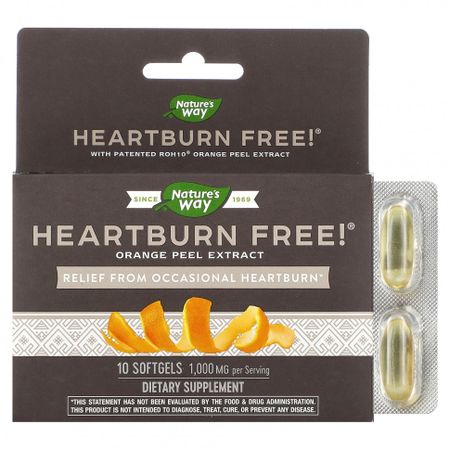 Описание С запатентованным экстрактом апельсиновой корки ROH10®На рынке с 1969 годаЭкстракт апельсиновой кожурыИзбавление от эпизодической изжоги1000 мг в 1 порции Пищевая добавкаКачественные ингредиенты от поставщиков со всего мира Без глютенаHeartburn Free® использует запатентованный экстракт апельсиновой корки для облегчения эпизодической изжоги в мягкой таблетке, которую нужно принимать только через день. В Natures Way® мы уверены, что природа знает все лучше. Именно поэтому мы отбираем самые качественные травы, которые только есть на земле. Таким образом мы обеспечиваем бескомпромиссное качество и помогаем вам вести здоровый образ жизни. Рекомендации по применению Взрослым (18 лет и старше) при появлении первых симптомов принимать по 1 капсуле через день в течение 20 дней и по 1 капсуле для периодического облегчения в дальнейшем. Лучше всего принимать за полчаса до или через час после еды, запивая водой или любимым напитком. Глотать целиком. Не кусайте и не открывайте капсулу. Ингредиенты Желатин, глицерин, очищенная вода.Без сахара, соли, дрожжей, пшеница, кукурузы, сои, молочных продуктов, искусственных красителей, ароматизаторов, консервантов. Предупреждения Этот продукт имеет блистер с защитой от вскрытия. Не следует использовать, если фольга или пластик повреждены!Не принимать во время беременности, кормления грудью, гастрита или язвенной болезни. В случае приема каких-либо препаратов перед использованием добавки проконсультируйтесь с медицинским работником. Хранить в недоступном для детей месте. Хранить в сухом прохладном месте. Пищевая ценностьРазмер порции: 1 капсула Количество в 1 порции% от суточной нормыЭкстракт апельсиновой цедры, стандартизированный до 98,5% d-лимонена1 г**** Суточная норма не определена.