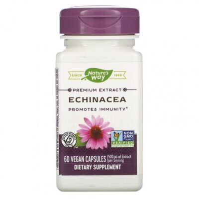 Пищевая ценностьРазмер порции: 2 капсулыПорций в упаковке: 30Количество в 1 порции% от суточной нормыЭкстракт эхинацеи узколистной (echinacea angustifolia) (корень), 4% эхинакозидов (20 мг)500 мг**Экстракт эхинацеи (echinacea purpurea) (стебель, листья, цветки)380 мг**** Суточная норма не определена. Компания основана в 1969 годуЭкстракт высшего качестваПовышает иммунитетСертификат Certified Authentic TRU-ID™Сертификат Non-GMO Project VerifiedПищевая добавкаВеганский продуктВ Nature’s Way® мы верим в то, что природа всегда знает лучше. Потому наша миссия — постараться отыскать самые полезные травы на земле. Мы доберемся до любого континента и любой страны, чтобы найти самые лучшие травы и изготовить для вас самые чистые растительные средства, обеспечить бескомпромиссное качество и помочь людям вести здоровый образ жизни. Это Nature’s Way™.