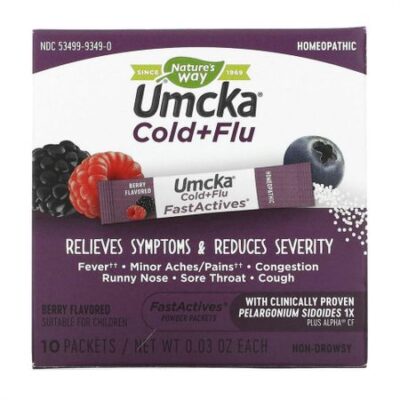 Nature’s Way, Umcka, Fast Actives, для лечения простуды и гриппа, не вызывает сонливость, с ягодным вкусом, 10 пакетов с порошком