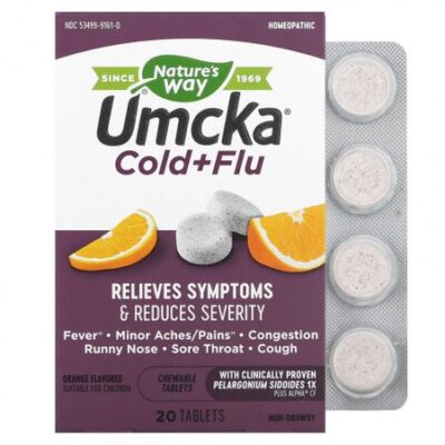 Клинически подтвержденная эффективностьUmcka® (Pelargonium sidoides 1X) сокращает продолжительность и уменьшает тяжесть простуды, раздражения носа, горла и бронхов.Вы можете быть уверены, что умка (Pelargonium sidoides 1X) доказала свою эффективность в клинических исследованиях для облегчения симптомов простуды, а также раздражения носа, горла и бронхов.Простуда + средство от гриппа††Клинически протестированные средства Umcka (Pelargonium sidoides 1X) и Alpha® CF объединены в одно комплексное комплексное средство от простуды и гриппа.Альфа CF (Aconitum napellus 4X, Bryonia 4X, Eucalyptus globulus 2X, Eupatorium perfoliatum 6x, Gelsemium sempervirens 4X, Ipecacuanha 3X и Phosphorus 6X) облегчает симптомы простуды и гриппа††.Использование: Сокращает продолжительность и уменьшает выраженность симптомов, связанных с простудой и раздражением горла / носа / бронхов, и временно облегчает симптомы гриппа:Озноб / лихорадка††ХрипотаЗаложенность носаНезначительные бол膆КашельЧихание / насморкГоловная боль††Боль в горл円 Эти показания только для традиционного применения. Рекомендации по применению Необходимо разжевывать или растворять таблетки во рту. Не глотать целиком.Для достижения наилучших результатов принимайте при возникновении первых симптомов и продолжайте принимать в течение 48 часов после прекращения симптомов.ВозрастДозировкаВзрослые и дети от 12 летпринимать по 1 жевательной таблетке 3 раза в день.Дети от 6 до 11 лет:Принимать по 1 жевательной таблетке 2 раза в день.Дети младше 6 летнеобходимо проконсультироваться с врачом. Ингредиенты Активный ингредиент (в каждой жевательной таблетке)НазначениеПеларгония (Pelargonium sidoides) 1Xускоряет выздоровление и уменьшает тяжесть симптомов заболеваний верхних дыхательных путейБорец клобучковый (Aconitum napellus) 4X, эвкалипт (Eucalyptus globulus) 2Xснижают боль и высокую температуру††Бриония (Bryonia) 4X, посконник (Eupatorium perfoliatum) 6Xуменьшают кашель††Гельземиум вечнозеленый (Gelsemium sempervirens) 4X, фосфор 6Xпомогают при чихании, насморке и боли в горл円Ипекакуана (Ipecacuanha) 3Xпротивозастойное средствВспомогательные ингредиентыЛимонная кислота, м…
