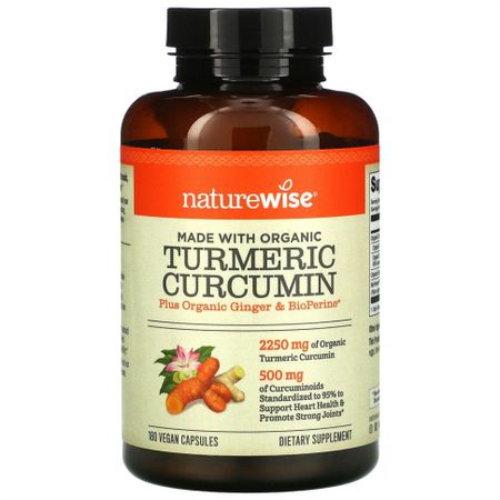 С органическим имбирем и BioPerine® 2250 мг куркумина из органической куркумы 500 мг куркуминоидов, стандартизованных до 95%, для поддержки здоровья сердца и укрепления суставов Пищевая добавка Веганский продукт Без ГМО Не содержит глютена Не содержит сои Специя для вкуса жизни Считается, что куркумин, полученный естественным путем из корня куркумы, традиционного азиатского лечебного средства и приправы, поддерживает здоровье сердца, мозга и суставов, способствуя нормальной воспалительной реакции и защищая клетки от окислительного стресса. Наша формула премиального качества включает органический экстракт куркумы, стандартизированный до 95% куркуминоидов. Для увеличения биодоступности в ее состав входят органический имбирь и BioPerine®.