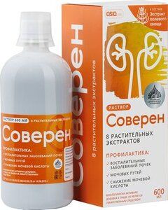 СОВЕРЕН — Биологически активная добавка (БАД) к пище — профилактика воспалительных заболеваний почек и мочевых путей, снижение уровня мочевой кислоты.Состав на 100 мл:Действующие вещества:хвоща полевого Equisetum arvense стеблей сухой экстракт — 570 мг,торичника красного Spergularia rubra сухой экстракт — 330 мг,болдо пеумус Peumus boldus листьев сухой экстракт — 280 мг,опунции индейской Opuntia ficus-indica цветков сухой экстракт — 170 мг,железницы узколистной Sideritis angustifolia цветков сухой экстракт — 170 мг,розмарина аптечного Rosmarinus officinalis листьев сухой экстракт — 170 мг,свинороя пальчатого Cynodon dactylon корневищ сухой экстракт — 170 мг,мелиссы лекарственной Melissa officinalis листьев сухой экстракт — 170 мг.Энергетическая ценность на 1 капсулу: 8,9 ккал (37,3 кДж).Пищевая ценность на 1 флакон: углеводы — 1,43 г, белки — 0,213 г, жиры — 0,44 гАКТИВНЫЕ ИНГРЕДИЕНТЫ: Кремниевая кислота, содержащаяся в стеблях хвоща полевого, препятствует кристаллизации солей мочевой кислоты. Флавоноиды и кумарины торичника красного, листьев болдо пеумуса и розмарина аптечного, цветков опунции и железницы узколистной полностью или частично растворяют оксалат кальция, фосфат кальция, ураты и другие составляющие почечных камней. Экстракт корневищ свинороя пальчатого обладает мочегонным действием. Фенилпропаноиды, входящие в состав листьев мелиссы лекарственной, обладают иммуномодулирующими и противомикробными свойствами.Дополнительное средство профилактики обострений подагры, особенно при подагрической нефропатии для уменьшения частоты и продолжительности приступов подагры.Препарат оказывает антигиперурикемическое действие, положительно влияет на сывороточный уровень мочевой кислоты и креатинина.Витамина С — 0,103 % от рекомендуемого суточного уровня потребления,Витамина А — 0,169 % от рекомендуемого суточного уровня потребления,Витамина В6 — 0,003 % от рекомендуемого суточного уровня потребления,Витамина В12 — 0,002 % от рекомендуемого суточного уровня потребления,Витамина Е — 0,024 % от рекомендуемого суточного уровня потребления.Способствует поддержанию кислотно-щелочного баланса, снижения рисков образования камней в почках.Нормализует мочевыделительную функцию, способствуя выведению из организма солей мочевой кислоты и вредных токсинов.Укрепляет иммунную систему и уменьшает вероятность инфекционных процессов в мочевых путях.Профилактика: Кислотно-щелочного баланса, Снижения рисков образования камней в почках, Мочевыделительной функции, Выведения из организма солей мочевой кислоты и вредных токсинов, Укрепления иммунной системы, Инфекционных процессов в мочевых путях.Преимущества: ФОРМА ВЫПУСКА — РАСТВОР — Позволяет сохранить максимальное количество активных ингредиентов, В СОСТАВЕ НЕТ СПИРТА — Возможно применение при СД, пациентам с аллергией, беременным и детям, ВЫПУСКАЕТСЯ В ОБЪЕМЕ 600 МЛ С МЕРНЫМ КОЛПАЧКОМ — Удобство дозирования для всех возрастных групп.
