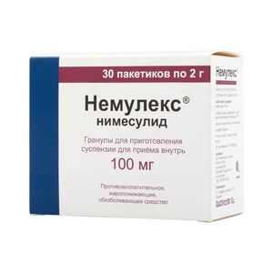 Показания к применениюРевматоидный артрит; Остеоартроз; Артриты различной этиологии; Артралгии; Миалгии; Послеоперационные и посттравматические боли; Бурсит; Тендинит; Апьгодисменорея; Зубная и головная боль.;Препарат предназначен для симптоматической терапии, уменьшая боли и воспаления на момент использования, на прогрессирование заболевания не влияет.Применение при беременности и кормлении грудьюПротивопоказано применение при беременности и в период лактации (грудного вскармливания).;Применение нимесулида может отрицательно влиять на женскую фертильность и не рекомендуется женщинам, планирующим беременность.ПротивопоказанияГиперчувствительность, полное или неполное сочетание бронхиальной астмы, рецидивирующего полипоза носа или околоносовых пазух и непереносимости ацетилсалициловой кислоты (АСК) и других НПВП (в т.ч. в анамнезе), эрозивно-язвенные поражения слизистой оболочки желудка и двенадцатиперстной кишки, активное желудочно-кишечное кровотечение, цереброваскулярное или иное кровотечение, воспалительные заболевания кишечника (болезнь Крона, язвенный колит) в фазе обострения, гемофилия и другие нарушения свертываемости крови, декомпенсированная хроническая сердечная недостаточность (ХСН), печеночная недостаточность или любое активное заболевание печени, гепатотоксические реакции при использовании нимесулида в анамнезе, алкоголизм, наркомания, выраженная хроническая почечная недостаточность (ХПН) (КК менее 30 мл/мин), прогрессирующие заболевания почек, подтвержденная гиперкалиемия, период после проведения аортокоронарного шунтирования, одновременный прием других гепатотоксических лекарственных средств (ЛС), детский возраст до 12 лет, беременность, период грудного вскармливания.;С осторожностью;Ишемическая болезнь сердца (ИБС), цереброваскулярные заболевания, ХСН, дислипидемия/гиперлипидемия, сахарный диабет, заболевания периферических артерий, курение, почечная недостаточность (КК менее 30-60 мл/мин), анамнестические данные о развитии язвенного поражения желудочно-кишечного тракта (ЖКТ), наличие инфекции Helicobacter pylori, пожилой возраст, длительное использование НПВП, тяжелые соматические заболевания, одновременный прием антикоагулянтов (в т.ч. варфарин), антиагрегантов (в т.ч. АСК, клопидогрел), пероральных глюкокортикостероидов (ГКС), селективных ингибиторов обратного захвата серотонина (в т.ч. циталопрам, флуоксетин, пароксетин, сертралин).;Состав1 пакетик препарата содержит: активное вещество: нимесулид 100 мг; вспомогательные вещества: макрогола цетостеарат (кремофор А25) — 100 мг, лимонная кислота безводная — 19 мг, кремния диоксид коллоидный (аэросил) — 40 мг, сахароза — 1721 мг, ароматизатор апельсиновый — 20 мг.