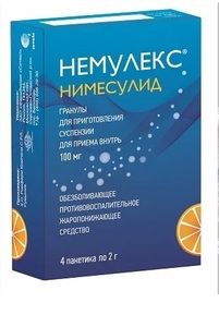 Показания к применению артриты различной этиологии; ревматоидный артрит; остеоартроз; артралгии; миалгии; послеоперационные и посттравматические боли; бурсит; тендинит; альгодисменорея; зубная и головная боль. Препарат предназначен для симптоматической терапии, уменьшая боли и воспаление на момент использования; на прогрессирование заболевания не влияет.ПротивопоказанияГиперчувствительность, полное или неполное сочетание бронхиальной астмы, рецидивирующего полипоза носа или околоносовых пазух и непереносимости АСК и др. НПВП (в т.ч. в анамнезе), эрозивно-язвенные поражения слизистой оболочки желудка и 12-перстной кишки, активное желудочно-кишечное кровотечение, цереброваскулярное или иное кровотечение, воспалительные заболевания кишечника (болезнь Крона, язвенный колит) в фазе обострения, гемофилия и др. нарушения свертываемости крови, декомпенсированная ХСН, печеночная недостаточность или любое активное заболевание печени, гепатотоксические реакции при использовании нимесулида в анамнезе, алкоголизм, наркомания, выраженная ХПН (КК менее 30 мл/мин), прогрессирующие заболевания почек, подтвержденная гиперкалиемия, период после проведения аортокоронарного шунтирования, одновременный прием др. гепатотоксических ЛС, беременность, период лактации, детский возраст до 12 лет.С осторожностью. ИБС, цереброваскулярные заболевания, ХСН, дислипидемия/гиперлипидемия, сахарный диабет, заболевания периферических артерий, курение, почечная недостаточность (КК 30-60 мл/мин), анамнестические данные о развитии язвенного поражения ЖКТ, наличие инфекции Helicobacter pylori, пожилой возраст, длительное использование НПВП, алкоголизм, тяжелые соматические заболевания, одновременный прием антикоагулянтов (в т.ч. варфарин), антиагрегантов (в т.ч. АСК, клопидогрел), пероральных ГКС, селективных ингибиторов обратного захвата серотонина (в т.ч. циталопрам, флуоксетин, пароксетин, сертралин).Состав1 пакетик:- нимесулид 100 мгвспомогательные вещества:макрогола цетостеарат (кремофор А25) — 100 мг,лимонная кислота безводная — 19 мг,кремния диоксид коллоидный (аэросил) — 40 мг,сахароза — 1721 мг,ароматизатор апельсиновый — 20 мг.