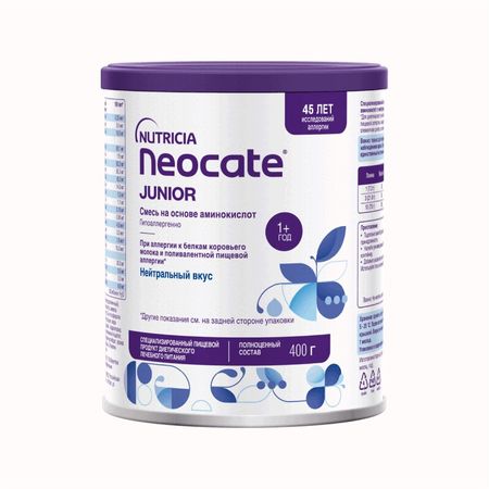 СПЕЦИАЛИЗИРОВАННЫЙ ПРОДУКТ ДИЕТИЧЕСКОГО ЛЕЧЕБНОГО ПИТАНИЯ ДЛЯ ДЕТЕЙ ОТ 1 ГОДА ДО 10 ЛЕТ: ГИПОАЛЛЕРГЕННАЯ СУХАЯ СМЕСЬ НА ОСНОВЕ АМИНОКИСЛОТ С НЕЙТРАЛЬНЫМ ВКУСОМ «НЕОКЕЙТ ДЖУНИОР»ВОЗМОЖНО ПРИМЕНЕНИЕ В СЛЕДУЮЩИХ СЛУЧАЯХ:• Пищевая аллергия, включая аллергию к белкам коровьего молока.• Эозинофильный эзофагит.• Синдром короткой кишки.• Мальабсорбция и другие состояния ЖКТ, требующие элементную диету.КЛЮЧЕВЫЕ ОСОБЕННОСТИ:• Специализированная смесь с учетом возрастных потребностей в макро- и микронутриентах для детей старше 1 года.• Не содержит цельный белок. Белковый эквивалент на 100 % представлен свободными заменимыми и незаменимыми аминокислотами, что позволяет исключить аллергические реакции.• Оптимальное содержание Кальция, Витамина D, Цинка и Железа для нормального роста и развития1,2.• 35 % жирового компонента смеси представлено среднецепочечными триглицеридами, которые не требуют ферментации, легко усваиваются без участия липазы и быстро восполняют энергетические затраты.• Хорошие вкусовые качества смеси.• Не содержит цельный белок, лактозу, фруктозу, сахарозу, глютен, холестерин и генетически модифицированные компоненты.ные компоненты.