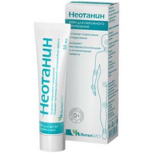 НЕОТАНИН крем для детей и взрослых — крем косметический, однородная масса, не содержащая посторонних примесей, цвет белый , запах легкий специфическийВозраст: с рождения, 0+При остром воспалении без мокнутия применяется НЕОТАНИН крем:•противовоспалительное, подсушивающее и вяжущее действие с антисептическим эффектом•двойное противозудное действие•быстрый противозудный эффект (в течение нескольких минут)•при локализации поражения на лице•при обширных (более 20% поверхности кожи) площадях поражения•у пациентов со стероидофобией (20—40% пациентов)•у пациентов с тяжелой сопутствующей соматической патологией•минимальный риск побочных реакций•не окрашивает кожу•отпускается без рецептаМеханизм действия:Основным активным компонентом НЕОТАНИНА является синтетический танин. Танины относятся к веществам, оказывающим вяжущее, подсушивающее действие благодаря способности связывать и осаждать протеины (белки).Вторым активным компонентом НЕОТАНИНА является полидоканол, который обладает противозудным действием. Противозудный эффект полидоканола развивается быстро, длительность действия составляет в среднем 3–4 часа. Также полидоканол усиливает вяжущее, подсушивающее действие танина и способствует заживлению эрозий.Механизм действия НЕОТАНИНАСвязывает белки тканевой жидкости в тонкую пленку. Предотвращается проникновение бактерий. Кожа подсушивается и регенерирует быстрее.Угнетает активность прововоспалительных ферментов.Блокирует передачу импульсов чувствительным нервным окончаниям.Лечебный эффектСоздает условия для быстрого заживления поврежденных участков кожи.Aнтисептический эффект.Помогает защитить поврежденные участки кожи от микробного воздействия и зуда.Противовоспалительный эффект. Устраняет покраснение и раздражение.Устраняет зуд, боль и раздражение.Область применения:Состояния кожи, сопровождающиеся нарушением целостности кожного покрова, раздражением и зудом. В том числе:•при обострении атопического, аллергического, контактного дерматита, экземе, псориазе и т.п.•при пеленочном (памперсном) дерматите•при ветряной оспе, герпесе, опоясывающем лишае и т.п.•при грибковых поражениях кожи с эрозиями и трещинами•при поверхностных пиодермиях•при всех дерматозах, сопровождающихся зудом (т.к. в составе полидоканол, который оказывает противозудное действие через несколько секунд после нанесения на кожу).Специальные особенности: Не содержит гормонов