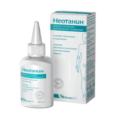 При остром воспалении с зудом и высыпаниями (мокнутием) применяется НЕОТАНИН лосьон (суспензия): • двойное противозудное действие • быстрый противозудный эффект (в течение нескольких минут) • противовоспалительное и вяжущее действие с антисептическим эффектом • более выраженный клинический эффект и сокращение сроков лечения по сравнению c классическими формами местной терапии • не содержит гормонов • применение не приводит к системным побочным эффектам • применяется у детей с рождения • при локализации поражения на лице • при обширных (более 20% поверхности кожи) площадях поражения • у пациентов со стероидофобией (20—40% пациентов) • у пациентов с тяжелой сопутствующей соматической патологией • минимальный риск побочных реакций • не окрашивает кожу • отпускается без рецепта • доступная цена. Механизм действия: Основным активным компонентом НЕОТАНИНА является синтетический танин. Танины относятся к веществам, оказывающим вяжущее, подсушивающее действие благодаря способности связывать и осаждать протеины (белки). Синтетический танин оказывает противовоспалительное действие (устраняет зуд, отек и покраснение), оказывает противомикробное действие, ускоряет заживление. Вторым активным компонентом НЕОТАНИНА является полидоканол, который обладает противозудным действием. Противозудный эффект полидоканола развивается быстро, длительность действия составляет в среднем 3–4 часа. Также полидоканол усиливает вяжущее, подсушивающее действие танина и способствует заживлению эрозий. Третьим активным компонентом НЕОТАНИНА лосьона (суспензии) является оксид цинка. Оксид цинка относится к веществам, оказывающим: вяжущий эффект – связывает белки кожи и белки тканевой жидкости в тонкую пленку на поверхности кожи и подсушивающее действие — уменьшает выраженность экссудативных процессов. Оксид цинка оказывает противовоспалительное и противомикробное действие. Область применения: Состояния кожи, сопровождающиеся зудом, нарушением целостности кожного покрова и высыпаниями (мокнутием) В том числе: • при обострении атопического, аллергического, контактного дерматита, экземе, псориазе и т.п. • при пеленочном дерматите • при ветряной оспе, герпесе, опоясывающем лишае и т.п. • при грибковых поражениях кожи с эрозиями и трещинами • при поверхностных пиодермиях • при всех дерматозах, сопровождающихся зудом (т.к. в составе полидоканол, который оказывает противозудное действие сразу после нанесения на кожу) • при солнечных и бытовых ожогах Период беременности и кормления грудью: НЕОТАНИН можно использовать в период беременности и кормления грудью. Однако в период кормления грудью не следует использовать средство в области молочных желез, чтобы избежать случайного перорального попадания препарата в организм младенца во время кормления.