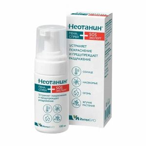 НЕОТАНИН® (NEOTANIN®) SOS ЭКСПЕРТ пена-спрей 100 мл — комбинированное средство для восстановления кожи при состояниях, связанных с солнечными, бытовыми, фитоожогами, поверхностными ранамиСОСТАВ:Синтетический танин, полидоканол, дикалий глициррицинат, Д-пантенол и аллантоин. ОБЛАСТЬ ПРИМЕНЕНИЯ:НЕОТАНИН SOS эксперт пена-спрей предназначен для восстановления кожи после солнечных, бытовых, фитоожогов, укусов насекомых, при поверхностных ранах (царапинах, трещинах, ссадинах, опрелостях), после косметологических процедур.АКТИВНЫЕ КОМПОНЕНТЫ:Синтетический танин устраняет покраснение, способствует снятию раздражения, образует защитную пленку, препятствует присоединению бактериальной флоры.Полидоканол снижает чувствительность рецепторов, обладает выраженным обезболивающим, противозудным действиями. Противозудный эффект полидоканола развивается быстро и продолжается в среднем 3-4 часа. Также полидоканол оказывает вяжущее действие и способствует заживлению эрозий.Д-пантенол способствует восстановлению кожи, ускоряет заживление.Дикалий глицирризинат – активный компонент корня солодки с выраженной противовоспалительной активностью, быстро снимает покраснение и раздражение кожи. При профилактическом применении успокаивает кожу, снижает степень выраженности аллергических реакций.Аллантоин стимулирует обновление и пролиферацию (деление) клеток.