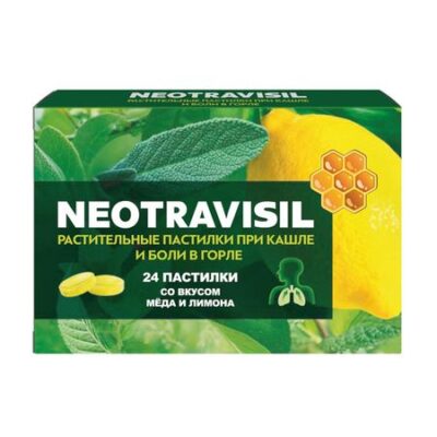Биологическое действие компонентов Растительное средство NEOTRAVISIL содержит инновационную комбинацию из 4 экстрактов лекарственных трав: солодки, эвкалипта, камфоры, мяты, а также экстракт плодов апельсина, которые, благодаря комплексному эффекту компонентов, обеспечивают двойное действие: помогают при кашле и боли в горле. • Экстракт мяты колосистой обладает спазмолитическим, антисептическим, обезболивающим действием, в том числе используется при боли в горле и простудных заболеваниях. • Экстракт солодки голой обладает противовоспалительным, отхаркивающим, спазмолитическим действием; применяется при заболеваниях верхних дыхательных путей (фарингит, трахеит, бронхит), сопровождающихся кашлем, хрипотой, болью в горле. Экстракт эвкалипта шаровидного оказывает противомикробное, отхаркивающее, обезболивающее, противовоспалительное и антисептическое действие; применяется при различных инфекционных заболеваниях, а также для их профилактики. • Экстракт плодов апельсина применяется для уменьшения количества мокроты, лечения кашля и простуды. • Экстракт коричника камфорного обладает антисептическим, отхаркивающим, обезболивающим и спазмолитическим действием. Полезные свойства компонентов проверены и подтверждены современными исследованиями и многолетним опытом применения. Растительные пастилки массой 2,5 г