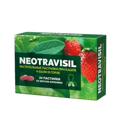 Неотрависил растительные пастилки со вкусом клубники. Биологическое действие компонентов Растительное средство NEOTRAVISIL содержит инновационную комбинацию из 4 экстрактов лекарственных трав: солодки, эвкалипта, коричника камфорного, мяты, а также экстракт пподов апельсина, которые, благодаря комплексному эффекту компонентов, обеспечивают двойное действие: помогают при кашле (сухом и влажном) и боли в горле. • Экстракт мяты колосистой обладает спазмолитическим, антисептическим, обезболивающим действием, в том числе используется при боли в горле и простудных заболеваниях. • Экстракт солодки голой обладает противовоспалительным, отхаркивающим. спазмолитическим действием; применяется при заболеваниях верхних дыхательных путей (фарингит, трахеит, бронхит), сопровождающихся кашлем. хрипотой, болью в горле. • Экстракт эвкалипта шаровидного оказывает противомикробное, отхаркивающос. обезболивающее. противовоспалительное и антисептическое действие: применяется при различных инфекционных заболеваниях, а также для их профилактики. • Экстракт плодов апельсина применяется для уменьшения количества мокроты, лечения кашля и простуды • Экстракт коричника камфорного обладает антисептическим, отхаркивающим. обезболивающим и спазмолитическим действием. Полезные свойства компонентов проверены и подтверждены современными исследованиями и многолетним опытом применения. Область применения NEOTRAVISIL способствует снижению риска развития острых и хронических воспалительных заболеваний дыхательных путей, сопровождающихся кашлем (фарингит, ларингит, в том числе «лекторский», трахеит, бронхит) и болью в горле. NEOTRAVISIL показан к приему в качестве биологически активной добавки к пище — источника ментола, содержащей эфирные масла. Пищевая и энергетическая ценность на 100 г: углеводы (сахар, глюкоза) — 92 г; 1560 кДж / 370 ккал.