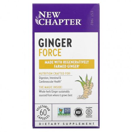 Пищевая ценностьРазмер порции: 1 капсула Количество в 1 порции% от суточной нормыВодный экстракт корневища имбиря (Zingiber officinale)96 мг*Сверхкритический экстракт корневища органического имбиря (Zingiber officinale)54 мг*Сверхкритический экстракт листьев розмарина (Rosmarinus officinalis)5 мг** Суточная норма не определена. Содержит имбирь, выращенный на регенеративной основе Сертификат Non GMO Project VerifiedОтсутствие глютена подтверждено сертификатом NSFСертификат B CorporationПищевая добавкаСертификат B CorporationНа 100% вегетарианский продуктБез искусственных ароматизаторов и красителейС благодарностью из ВермонтаПитательные вещества для здоровья кишечника, пищеварительной и сердечно-сосудистой системИдеальный состав Цельный имбирь, произведенный экологичным способом в местах, где он растет лучше всего.Живите на полную. Питайтесь правильноНаше отличие — экстракция полного спектра. Многие компании отделяют элементы из растений, концентрируют их и маркируют как «Цельное растение». Компания New Chapter® предоставляет цельнопищевые продукты благодаря мудрости природы. Наши экстракты Force содержат широкий спектр фитонутриентов природного происхождения, полученных с использованием только сверхкритического CO2 и традиционных методов экстракции.Herbal. Holistic. Health.™Поддержка пищеваренияИмбирь широко используется для поддержки здорового пищеварения и здоровья желудочно-кишечного тракта. Активные ингредиенты поддерживают рост полезных кишечных микроорганизмов, которые жизненно необходимы для здоровья кишечника.Поддержка сердечно-сосудистой системыКак показывают доклинические лабораторные исследования, наш цельный имбирь поддерживает здоровье тромбоцитов и работу сердечно-сосудистой системы.Полный спектр эффективностиМы используем цельнопищевые продукты, чтобы предоставить широкий спектр целебных свойств природных соединений имбиря путем извлечения цельного корня с применением как сверхкритических, так и традиционных методов.Чистые и эффективные экстрактыНаши на 100% вегетарианские капсулы, произведенные экологичным способом, сохраняют чистоту и эффективность растений, быстро растворяются и незамедлительно всасываются в организм.