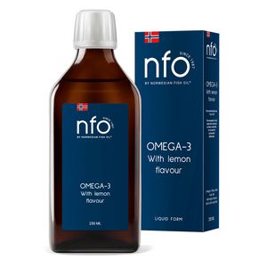 NFO® Omega-3 with lemon flavor (НФО Омега-3 со вкусом лимона) — натуральный высокоочищенный рыбий жир в жидкой форме со вкусом лимона. Производится из дикой рыбы, обитающей в чистейшем Норвежском море. Для производства комплекса NFO® Omega-3 with lemon flavor используются тушки рыб: анчоусовых, ставридовых, сельдевых, корюшковых, скумбриевых, песчанковых.NFO® Omega-3 with lemon flavor содержит полиненасыщенные жирные кислоты — эйкозапентаеновую (ЭПК) и докозагексаеновую (ДГК). Эти аминокислоты являются строительным материалом для мембран клеток всех органов и систем человеческого организма, но самим организмом не синтезирует, а поступают только извне. Эйкозапентаеновая и докозагексаеновая кислоты являются наиболее важными Омега-3 жирными кислотами и оказывают выраженный эффект на все органы и системы, в том числе на сердечно-сосудистую систему, обмен жиров и кальция в организме, способствуют уменьшению болей при артрозе суставов, укрепляют нервную систему, улучшают память, внимание, мыслительные функции, улучшает внешний вид и качество кожи, волос, ногтей, повышает силу, выносливость, улучшают настроение.Рекомендуется людям с повышенным риском заболеваний сердечно-сосудистой, нервной систем, нарушением обмена веществ (гиперхолестеринемией, снижением толерантности к глюкозе, депрессивными состояниями и др.), а также для людей, ведущих активный образ жизни, занимающихся спортом, фитнесом. Помимо всего этого NFO® Omega-3 with lemon flavor превосходно подходит для заправки салатов и других блюд. Блюда с заправкой NFO® Omega-3 with lemon flavor стали популярны благодаря своим прекрасным вкусовым качествам.NFO® Omega-3 with lemon flavor — Лауреат премии «Здоровое Питание 2017» в номинации «Лучшая торговая марка» в категории «Витамины и БАД».Свойства: Компенсирует недостаток ПНЖК Омега-3 в организме Снижает риск возникновения сахарного диабета 2го типа Нормализует обменные процессы и метаболизм жиров у лиц с избыточным весом Уменьшает риск сердечно-сосудистых заболеваний и воспалительных заболеваний костей и суставов Улучшает состояние репродуктивной системы мужчин и женщин Укрепляет нервную систему, улучшает память внимание Улучшает внешний вид и качество кожи, волос и ногтей Повышает силу, выносливость, улучшает настроение.Содержание в суточной дозе (1 чайная ложка)ПНЖК омега-3 – 1540 мгв т.ч.эйкозапентаеновая кислота – 736 мгдокозагексаеновая кислота – 460 мгВитамин Е – 5 мг