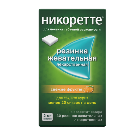 Описание: Для дозировки 2 мг: квадратная, покрытая оболочкой белого или почти белого цвета подушечка размером приблизительно 15×15×6 мм для дозировки 4 мг: квадратная, покрытая оболочкой светло-желтого с коричневатым или зеленоватым оттенком цвета подушечка размером приблизительно 15×15×6 мм Для обеих дозировок допускается наличие небольших неровностей по бокам. ФАРМАКОЛОГИЧЕСКИЕ СВОЙСТВА Фармакотерапевтическая группа: средство для лечения никотиновой зависимости Код АТХ: N07BA01 Фармакодинамика После резкого отказа от курения у пациентов, ежедневно использовавших табакосодержащие продукты в течение длительного времени, возможно развитие синдрома «отмены», который включает в себя: дисфорию, бессонницу, повышенную раздражительность, тревогу, нарушение концентрации внимания, снижение частоты сердечных сокращений, увеличение аппетита или прибавку в весе. Важным симптомом синдрома «отмены» является также желание курить. При лечении табачной зависимости заместительная терапия никотином снижает потребность в числе выкуриваемых сигарет и стиков для систем нагревания табака, снижает выраженность симптомов синдрома «отмены», возникающих при полном отказе от курения у тех, кто решил бросить курить, облегчает временное воздержание от курения, а также способствует уменьшению количества выкуриваемых сигарет и стиков для систем нагревания табака у тех, кто не может или не хочет полностью отказаться от курения. Фармакокинетика Никотин, поступающий из жевательной резинки, быстро всасывается через слизистую оболочку щеки и обнаруживается в крови через 5–7 мин. Максимальная концентрация никотина достигается через 30 мин после начала жевания. Объем распределения никотина при внутривенном введении равняется около 2–3 л/кг, а период полувыведения — примерно 2 ч. Никотин в основном выводится печенью, его средний плазменный клиренс составляет около 70 л/ч. Никотин метаболизируется также в почках и легких. Идентифицировано более 20 метаболитов никотина, которые уступают ему по активности. Связь никотина с белками плазмы составляет менее 5%. В связи с этим нарушения связывания никотина при одновременном применении других препаратов или при гипоальбуминемии при различных заболеваниях не должны оказывать существенного влияния на кинетику никотина. Первичный метаболит никотина в плазме — котинин — имеет период полувыведения 15–20 ч, а его концентрация превышает таковую никотина в 10 раз. С мочой выводятся в основном котинин (15% дозы) и транс-3-гидрокси-котинин (45% дозы). От 10% до 30% дозы никотина выводится с мочой в неизмененном виде. Прогрессирующее ухудшение функции почек сопровождается снижением общего клиренса никотина. Его фармакокинетика не меняется у больных циррозом печени с незначительно выраженными нарушениями функции печени (балл 5 по Чайлд-Пью) и снижается у больных циррозом печени с умеренным нарушением функции печени (балл 7 по Чайлд-Пью). У курильщиков, получавших лечение гемодиализом, отмечали повышение концентрации никотина в плазме крови. У пожилых пациентов отмечается небольшое снижение общего клиренса никотина, что не требует коррекции дозы. ПОКАЗАНИЯ К ПРИМЕНЕНИЮ Лечение табачной зависимости путем снижения потребности в никотине в следующих случаях: • уменьшение симптомов синдрома «отмены», возникающих при полн