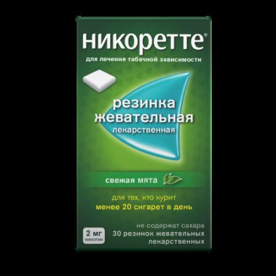 ОПИСАНИЕ Для дозировки 2 мг: квадратная, покрытая оболочкой белого или почти белого цвета подушечка с запахом мяты размером приблизительно 15×15×6 мм. Для дозировки 4 мг: квадратная, покрытая оболочкой светло-желтого с коричневатым или зеленоватым оттенком цвета подушечка c запахом мяты размером приблизительно 15×15×6 мм. Для обеих дозировок допускается наличие небольших неровностей по бокам. ФАРМАКОЛОГИЧЕСКИЕ СВОЙСТВА Фармакотерапевтическая группа: средство для лечения никотиновой зависимости Код АТХ: N07BA01 Фармакодинамика После резкого отказа от курения у пациентов, ежедневно использовавших табакосодержащие продукты в течение длительного времени, возможно развитие синдрома отмены, который включает в себя: дисфорию, бессонницу, повышенную раздражительность, тревогу, нарушение концентрации внимания, снижение частоты сердечных сокращений, увеличение аппетита или прибавку в весе. Важным симптомом синдрома отмены является также желание курить. При лечении табачной зависимости заместительная терапия никотином снижает потребность в числе выкуриваемых сигарет и стиков для систем нагревания табака, снижает выраженность симптомов отмены, возникающих при полном отказе от курения у тех, кто решил бросить курить; облегчает временное воздержание от курения, а также способствует уменьшению количества выкуриваемых сигарет и стиков для систем нагревания табака у тех, кто не может или не хочет полностью отказаться от курения. Фармакокинетика Никотин, поступающий из жевательной резинки, быстро всасывается через слизистую оболочку щеки и обнаруживается в крови через 5-7 минут. Максимальная концентрация никотина достигается через 30 минут после начала жевания. Объем распределения никотина при внутривенном введении равняется около 2-3 л/кг, а период полувыведения – примерно 2 ч. Никотин в основном выводится печенью, его средний плазменный клиренс составляет около 70 л/ч. Никотин метаболизируется также в почках и легких. Идентифицировано более 20 метаболитов никотина, которые уступают ему по активности. Связь никотина с белками плазмы составляет менее 5%. В связи с этим нарушения связывания никотина при одновременном применении других препаратов или изменения уровней белков плазмы при различных заболеваниях не должны оказывать существенного влияния на кинетику никотина. Первичный метаболит никотина в плазме – котинин – обладает периодом полувыведения 15-20 ч, а его концентрация превышает таковую никотина в 10 раз. С мочой выводятся в основном котинин (15% дозы) и транс-3-гидрокси-котинин (45% дозы). От 10% до 30% дозы никотина выводится с мочой в неизмененном виде. Прогрессирующее ухудшение функции почек сопровождается снижением общего клиренса никотина. Его фармакокинетика не меняется у больных циррозом печени с незначительно выраженными нарушениями функции печени (индекс 5 по Чайлд-Пью) и снижается у больных циррозом печени с умеренным нарушением функции печени (индекс 7 по Чайлд-Пью). У курильщиков, получавших лечение гемодиализом, отмечали повышение концентрации никотина в плазме крови. У пожилых пациентов отмечается небольшое снижение общего клиренса никотина, что не требует коррекции дозы. ПОКАЗАНИЯ К ПРИМЕНЕНИЮ Лечение табачной зависимости путем снижения потребности в никотине в следующих случаях: • уменьшение симптомов отме