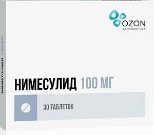 Круглые двояковыпуклые таблетки светло-желтого цвета, допускается наличие вкраплений желтого цвета. , Нестероидный противовоспалительный препарат (НПВП)Нимесулид является нестероидным противовоспалительным средством из класса сульфонамидов. Оказывает противовоспалительное, обезболивающее и жаропонижающее действие. В отличие от неселективных НПВП, нимесулид главным образом ингибирует циклооксигеназу-2 (ЦОГ-2), тормозит синтез простагландинов в очаге воспаления, оказывает менее выраженное угнетающее воздействие на циклооксигеназу-1 (ЦОГ-1). , Всасывание Нимесулид хорошо всасывается из желудочно-кишечного тракта (ЖКТ). Максимальная концентрация в плазме крови (Сmах) после перорального приема однократной дозы нимесулида (100 мг) достигается в среднем через 2-3 ч и составляет 3-4 мг/л. Распределение Связь с белками плазмы крови до 97,5%. Проникает в ткани женских половых органов, где после однократного приема его концентрация составляет около 40% от концентрации в плазме. Хорошо проникает в кислую среду очага воспаления (40%), синовиальную жидкость (43%). Легко проникает через гистогематические барьеры. Метаболизм Нимесулид активно метаболизируется в печени при помощи изофермента цитохрома Р450 (СYР)2С9. Существует возможность лекарственного взаимодействия нимесулида при одновременном применении с препаратами, метаболизирующимися изоферментом СYР2С9. Основным метаболитом является фармакологически активное парагидроксипроизводное нимесулида — гидроксинимесулид, обнаруживающийся в плазме крови преимущественно в конъюгированном виде, в виде глюкуроната. Выведение Период полувыведения (Т1/2) нимесулида около 1,56-4,95 часа, гидроксинимесулида — 2,89-4,78 часа. Нимесулид выводится из организма главным образом почками (около 50% от принятой дозы). Гидроксинимесулид выводится почками (65%) и с желчью (35%), подвергается энтерогепатической рециркуляции. Применение у пациентов пожилого возраста. Фармакокинетический профиль нимесулида у лиц пожилого возраста не изменяется при применении однократных и многократных/повторных доз. Применение у пациентов с заболеванием почек. В краткосрочном исследовании, проведенном у пациентов с почечной недостаточностью легкой и умеренной степени тяжести (клиренс креатинина 30-60 мл/мин), Сmах нимесулида и его основного метаболита были не выше, чем у здоровых добровольцев. Площадь под кривой «концентрация-время» (AUC) и T1/2 были на 50% выше, но находились в пределах значений AUC и T1/2, наблюдаемых у здоровых добровольцев на фоне применения нимесулида. Повторное применение не приводило к кумуляции нимесулида. , Терапия острой боли: боль в нижней части спины и/или области поясницы, болевой синдром, связанный с заболеваниями опорно-двигательного аппарата, в том числе тендиниты, бурситы, боль при ушибах, растяжениях связок и вывихах суставов, зубная боль, симптоматическое лечение остеоартроза (остеоартрита) с болевым синдромом, первичная альгодисменорея. Препарат предназначен для симптоматической терапии, уменьшения боли и воспаления на момент использования, на прогрессирование заболевания не влияет. Нимесулид рекомендуется для терапии в качестве препарата второй линии. , Беременностъ Нимесулид противопоказан во время беременности (риск атонии матки и преждевременного закрытия артериального протока у плода). Грудн