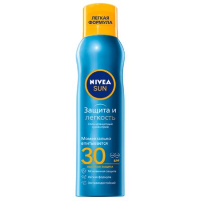 Сухой солнцезащитный спрей Защита и Легкость SPF 30 от NIVEA Sun с освежающей, легкой и нежирной формулой мгновенно впитывается, дарит коже приятный эффект прохлады и обеспечивает высокоэффективную защиту от UVA и UVB-лучей. Прозрачная формула не оставляет белых следов на коже. Формат спрея позволяет легко нанести средство, распыляя из любого положения. Экстраводостойкий — защита от солнца даже в воде. Способ применения: обильно нанесите на кожу за 20-30 минут до выхода на солнце и дождитесь полного впитывания средства перед тем, как надевать одежду. Не распыляйте на лицо и глаза. Обновляйте защитный слой регулярно, особенно после купания и вытирания полотенцем. Доверь защиту от солнца бренду NIVEA • Экстраводостойкий; • Моментально впитывается; • Мгновенная защита; • Не оставляет следов на коже; • С заботой об океане: формула без УФ-фильтров Октиноксат, Оксибензон, Октокрилен