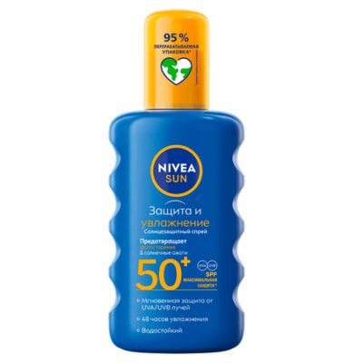 олнцезащитный спрей «Защита и увлажнение» с SPF 50+ от NIVEA SUN обеспечивает мгновенную и эффективную защиту от UVA и UVB-лучей. Его ухаживающая формула поддерживает защитный барьер кожи и увлажняет ее. С заботой об океане: формула не содержит микропластик, Октиноксат, Оксибензон, Октокрилен. Способ применения: обильно нанесите на кожу до начала пребывания на солнце и дождитесь полного впитывания средства перед тем, как надевать одежду. Не распыляйте непосредственно на лицо, чтобы не попасть в глаза. Часто обновляйте защитный слой, особенно после купания и вытирания полотенцем. Избегайте чрезмерного пребывания на солнце в период повышенной солнечной активности. Дерматологически протестировано. Доверь защиту от солнца бренду NIVEA. Спрей легко впитывается и является водостойким.