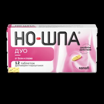 Показания Дротаверин при приеме внутрь быстро и практически полностью всасывается, абсорбция — высокая, период полуабсорбции — 12 мин. Биодоступность — 100%. Равномерно распределяется в тканях, проникает в гладкомышечные клетки. Время достижения Cmax — 2 ч. Связывание с белками плазмы составляет 95-98%. Т1/2 — 1-4 ч. В основном выводится почками, в меньшей степени — с желчью. Не проникает через ГЭБ. Парацетамол быстро всасывается из ЖКТ и распределяется в большинство органов и тканей. Абсорбция — высокая, Cmax достигается через 0.5-2 ч и составляет — 5-20 мкг/мл. Связывание с белками плазмы — 15%. Проникает через ГЭБ. Менее 1% от принятой кормящей матерью дозы парацетамола проникает в грудное молоко. Метаболизируется в печени (90-95%): 80% вступает в реакции конъюгации с глюкуроновой кислотой и сульфатами и образованием неактивных метаболитов. При недостатке глутатиона эти метаболиты могут блокировать ферментные системы гепатоцитов и вызывать их некроз. В метаболизме препарата также участвует изофермент CYP2E1. Т1/2 — 1-4 ч. Выводится почками в виде метаболитов, преимущественно конъюгатов, только 3% — в неизменном виде. Фармакокинетика у особых групп пациентов У пожилых больных снижается клиренс препарата и увеличивается Т1/2. Фармакологическое действие Фармакодинамика Комбинированный препарат, действие которого обусловлено входящими в его состав компонентами. Дротаверин — производное изохинолина, обладающее спазмолитическим действием в отношении гладкой мускулатуры (ингибирование фермента ФДЭ4, увеличение концентрации цАМФ, который, инактивируя фермент миозинкиназу, приводит к расслаблению гладкой мускулатуры). Дротаверин также обладает слабым ингибирующим действием на кальмодулин-зависимые кальциевые каналы. Независимо от типа вегетативной иннервации, дротаверин эффективен при спазмах гладкой мускулатуры. Действует на гладкие мышцы, находящиеся в сосудистой, желудочно-кишечной, желчевыводящей и урогенитальной системах (содержание ФДЭ4 в различных тканях различно). Парацетамол оказывает анальгезирующее и жаропонижающее действие преимущественно путем ингибирования синтеза простагландинов в ЦНС. В воспаленных тканях клеточные пероксидазы нейтрализуют действие парацетамола, что объясняет практически полное отсутствие противовоспалительного эффекта. Отсутствие блокирующего влияния на синтез Pg в периферических тканях обусловливает отсутствие у парацетамола отрицательного влияния на водно-солевой обмен (задержка натрия и воды) и слизистую оболочку ЖКТ. Лекарственное взаимодействие Дротаверин снижает действие леводопы (могут усиливаться тремор и ригидность). При совместном применении парацетамола с хлорамфениколом увеличивается Т1/2 хлорамфеникола и усиливается его токсичность. Одновременное применение парацетамола с доксорубицином увеличивает риск развития нарушений функции печени. Парацетамол снижает эффект урикозурических препаратов. Метоклопрамид и домперидон усиливают абсорбцию парацетамола, а колестирамин ее уменьшает. Сопутствующее применение парацетамола в высоких дозах повышает эффект антикоагулянтных лекарственных средств (снижение синтеза прокоагулянтных факторов в печени). Индукторы микросомального окисления в печени (фенитоин, барбитураты, рифампицин, фенилбутазон, трициклические антидепрессан