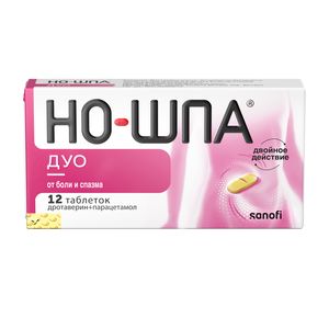 Главная » Аптека Но-шпа Дуо таблетки 40 мг+500 мг 12 шт Просмотров 5 Продолговатые таблетки желтого цвета с риской с одной стороны. Санофи