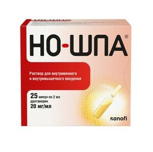 Показания к применениюСпазмы гладкой мускулатуры, при заболеваниях желчевыводящих путей: холецистолитиаз, холангиолитиаз, холецистит, перихолецистит, холангит, папиллит; спазмы гладкой мускулатуры мочевого тракта: нефролитиаз, уретролитиаз, пиелит, цистит, спазмы мочевого пузыря.; В качестве вспомогательной терапии: спазмы гладкой мускулатуры ЖКТ: язвенная болезнь желудка и двенадцатиперстной кишки, гастрит, спазмы кардии и привратника, энтерит, колит, спастический колит с запором и синдром раздраженного кишечника с метеоризмом; головные боли напряжения; дисменорея (менструальные боли).;Применение при беременности и кормлении грудьюВ проведенных исследованиях не выявлено тератогенное и эмбриотоксическое действие дротаверина, а также неблагоприятное воздействие на течение беременности. Однако при необходимости применения препарата Но-шпа во время беременности, следует соблюдать осторожность, и назначать препарат только после оценки соотношения потенциальной пользы для матери и возможного риска для плода.; В связи с отсутствием необходимых клинических данных в период грудного вскармливания назначать не рекомендуется;ПротивопоказанияПовышенная чувствительность к действующему веществу или любому из вспомогательных веществ препарата; тяжелая печеночная или почечная недостаточность; тяжелая сердечная недостаточность (синдром низкого сердечного выброса); детский возраст (применение дротаверина у детей в клинических исследованиях не изучалось); период кормления грудью (клинические исследования отсутствуют); редкая наследственная непереносимость галактозы, дефицит лактазы и синдром мальабсорбции глюкозы-галактозы (из-за присутствия в составе препарата лактозы).; С осторожностью: артериальная гипотензия; пациенты детского возраста (недостаточность клинического опыта применения); беременность ;Побочное действиеНиже представлены неблагоприятные реакции, наблюдавшиеся в клинических исследованиях, разделенные по системам органов с указанием частоты их возникновения в соответствии со следующей градацией: очень часто (≥10%), часто (≥1, <10%); нечасто (≥0,1, <1%); редко (≥0,01, <0,1%); очень редко, включая отдельные сообщения (<0,01%); неизвестная частота (по имеющимся данным частоту определить нельзя).; Со стороны ССС: редко — ощущение сердцебиения, снижение АД.; Со стороны ЦНС: редко — головная боль, головокружение, бессонница.; Со стороны ЖКТ: редко — тошнота, запор.; Со стороны иммунной системы: редко — аллергические реакции (ангионевротический отек, крапивница, сыпь, зуд) ;СоставВ 1 амп. дротаверина гидрохлорид 40 мг.; Вспомогательные вещества: натрия дисульфит (натрия метабисульфит) — 2 мг, этанол 96% — 132 мг, вода д/и — до 2 мл. ;