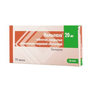 Показания к применениюЯзвенная болезнь желудка или двенадцатиперстной кишки в фазе обострения, синдром Золлингера-Эллисона, эрадикация Helicobacter pylori (в комбинации с антибактериальной терапией), рефлюкс-эзофагит.Применение при беременности и кормлении грудьюДля таблеток, покрытых кишечнорастворимой оболочкойПеред началом терапии необходимо исключить наличие злокачественного новообразования (эндоскопический контроль, при необходимости с биопсией — особенно при язве желудка), т.к. лечение, маскируя симптоматику, может отсрочить постановку правильного диагноза.Если через 4 нед терапии пантопразолом у пациента отсутствует желаемый лечебный эффект, он должен пройти повторное обследование. Как и другие ингибиторы протонной помпы, пантопразол может уменьшать всасывание цианокобаламина (витамина В12) на фоне гипо- и ахлоргидрии. Особенно это следует учитывать при длительном лечении и у пациентов с факторами риска дефицита витамина В12.Проведение длительной терапии, особенно продолжительностью более 1 года, требует регулярного наблюдения за пациентом.Влияние на способность управлять автомобилем и другими механическими средствами. Препарат не влияет на способность управлять автомобилем или другими техническими средствами.Для лиофилизата для приготовления раствора для внутривенного введенияПрименение пантопразола не рекомендуется для лечения легкой степени симптомов со стороны ЖКТ таких как диспепсия неврогенного генеза.Пациенты должны проконсультироваться с врачом при возникновении следующих симптомов:значимое непреднамеренное снижение массы тела,периодическая рвота,расстройство глотания,желудочно-кишечное кровотечение,анемия или мелена.При подозрении или наличии язвы желудка перед началом лечения пантопразолом следует исключить возможность злокачественного новообразования, т.к. применение препарата Нольпаза может маскировать симптомы и отсрочить правильную постановку диагноза. Если симптомы сохраняются, несмотря на адекватную терапию, то необходимо провести дополнительное обследование.У пациентов с тяжелым нарушением функции печени необходимо контролировать биохимические показатели сыворотки крови. При увеличении активности печеночных ферментов следует прекратить применение препарата.При применении препаратов, снижающих кислотность желудочного сока, незначительно повышается риск развития желудочно-кишечных инфекций, возбудителями которых являются бактерии рода Salmonella spp., Campylobacter spp.Влияние на способность управления автотранспортом и другими техническими устройствами. Следует воздержаться от управления транспортными средствами и другими механизмами, требующими повышенного внимания, т.к. возможно развитие головокружения и нарушение зрения.СоставДействующее вещество: Пантопразол.Концентрация действующего вещества (мг): 20 мг.