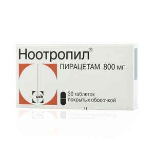 Показания к применению- Симптоматическое лечение психоорганического синдрома, в частности у пожилых больных, страдающих снижением памяти, головокружением, пониженной концентрацией внимания и общей активности, изменением настроения, расстройством поведения, нарушением походки, а также у пациентов с болезнью Альцгеймера и сенильной деменции типа Альцгеймера. — Лечение последствий инсульта, таких как нарушения речи, нарушения эмоциональной сферы, для повышения двигательной и психической активности. — Хронический алкоголизм — для лечения психоорганического и абстинентного синдромов. — Период восстановления после коматозных состояний, в том числе после травм и интоксикаций головного мозга. — Лечение головокружения и связанных с ним расстройств равновесия, за исключением головокружений сосудистого и психического происхождения. — В составе комплексной терапии низкой обучаемости у детей с психоорганическим синдромом. — Для лечения кортикальной миоклонии в качестве моно- или комплексной терапии. — В комплексной терапии серповидноклеточной анемии.Применение при беременности и кормлении грудьюАдекватных и строго контролируемых исследований безопасности применения Ноотропила при беременности не проводилось. Контролируемых исследований применения препарата во время беременности не проводилось.Пирацетам проникает через плацентарный барьер. Концентрация препарата у новорожденных достигает 70-90% от концентрации его в крови у матери. Ноотропил не следует назначать при беременности.Пирацетам выделяется с грудным молоком. При назначении препарата в период лактации следует воздержаться от грудного вскармливания.Противопоказания- Индивидуальная непереносимость пирацетама или производных пирролидона, а также других компонентов препарата. — Острое нарушение мозгового кровообращения (геморрагический инсульт). — Конечная стадия почечной недостаточности (при клиренсе креатинина менее 20 мл/мин). — Детский возраст до 1 года (для раствора для приема внутрь, 200 мг/мл) и до 3-х лет (для капсул и таблеток).Побочное действиеСо стороны ЦНС: гиперкинезия (1. 72%), нервозность (1. 13%), сонливость (0. 96%), депрессия (0. 83%), астения (0. 23%). Эти побочные эффекты чаще возникает у пациентов пожилого возраста, получавших препарат в дозе более 2. 4 г/сут. В отдельных случаях — головокружение, головная боль, атаксия, нарушение равновесия, обострение течения эпилепсии, бессонница, замешательство, возбуждение, тревога, галлюцинации, повышение сексуальности. Со стороны обмена веществ: увеличение массы тела (1. 29%). Со стороны пищеварительной системы: в отдельных случаях — тошнота, рвота, диарея, боли в животе. Дерматологические реакции: дерматит, зуд, сыпь, отек.СоставДействующее вещество: ПирацетамВспомогательные вещества: кремния диоксид, магния стеарат, Макрогол 6000, натрия кроскармеллоза.Концентрация действующего вещества (мг): 800 мг