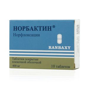 Показания к применениюПрепарат применяют для терапии пациентов, страдающих инфекционными заболеваниями, вызванными микроорганизмами, чувствительными к действию норфлоксацина, в том числе:Инфекционные заболевания органов мочевыводящей системы.Инфекционные заболевания органов желудочно-кишечного тракта.Препарат также применяется для терапии пациентов с неосложненной гонококковой инфекцией.Препарат может быть назначен для профилактики диареи путешественников.Применение при беременности и кормлении грудьюНорфлоксацин противопоказан при беременности и в период лактации (грудного вскармливания), поскольку в экспериментальных исследованиях установлено, что он вызывает артропатию.ПротивопоказанияПротивопоказан больным с анамнестическими указаниями на гиперчувствительность к норфлоксацину или любому другому химическому аналогу. Его не следует применять больным с тяжелой почечной недостаточностью (клиренс креатинина менее 10 мл/мин/1.73 м2) и беременным.Побочное действиеСо стороны пищеварительной системы анорексия, горечь во рту, тошнота, рвота, абдоминальные боли, диарея, псевдомембранозный энтероколит (при длительном применении), повышение активности печеночных трансаминаз.Со стороны мочевыделительной системы кристаллурия, гломерулонефрит, дизурия, полиурия, альбуминурия, уретральные кровотечения, гиперкреатининемия.Со стороны нервной системы головная боль, головокружение, бессонница, галлюцинации.Со стороны сердечно-сосудистой системы тахикардия, аритмии, снижение АД, обморок, васкулит.Аллергические реакции кожный зуд, крапивница, отеки, синдром Стивенса-Джонсона.Со стороны опорно-двигательного аппарата артралгия, тендиниты, разрывы сухожилий.Со стороны органов кроветворения лейкопения, эозинофилия, снижение гематокрита.Прочие кандидоз.СоставВ 1 таблетке содержится: Активное вещество: норфлоксацин 400 мг Вспомогательные вещества: МКЦ, кроскармеллоза натрия, натрия лаурилсульфат, крахмал кукурузный, кремния диоксид коллоидный, магния стеарат, тальк очищенный оболочка: гипромеллоза, макрогол 400, тальк очищенный, титана диоксид, вода очищенная (теряется в процессе производства)