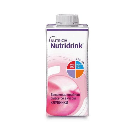 Nutridrink — cбалансированный источник белка, энергии и необходимых нутриентов, помогает восстановить силы после болезни. Продукт предназначен для взрослых пациентов с недостаточностью питания или риском ее развития, возникающими при инсульте, травмах, инфекциях, хронической обструктивной болезни легких, хронических заболеваниях системы пищеварения, в пред- и послеоперационный период Высококалорийный продукт содержит натуральные каротиноиды, витамины группы B, С, Е , D3 , К, фолиевую и пантотеновую кислоты, микроэлементы (хром, селен, медь) и минеральные вещества (натрий, калий, кальций, фосфор, магний, железо, цинк, марганец). В линейке представлено 3 вкуса для разнообразия рациона: ваниль, клубника, банан. Может употребляться в качестве дополнительного или единственного источника питания. Клинически значимый эффект наступает при приеме не менее чем в течение 14 дней. Длительность приема не ограничена (1–3 бутылочки в день как дополнение к диете, 5–7 бутылочек в день как единственный источник питания, если иное не назначено врачом). Только для энтерального питания. Не использовать парентерально. Возраст: С 18 лет Показания к применению: • Состояние после перенесенного инсульта и период реабилитации. • Восстановление и реабилитация после перенесенных критических состояний. • Пре- и послеоперационный период. • Заболевания желудочно-кишечного тракта (ЖКТ): лучевые энтериты, химиотерапия, холецистит, панкреатит, фистулы. • Состояния, связанные с потерей аппетита и/или отказом от приема пищи: онкологические заболевания, неврологические заболевания, психические расстройства; болезни печени, сердечно-сосудистая недостаточность, СПИД, стресс. • Недостаточность питания любой этиологии или риск ее развития. Ключевые особенности: • Полноценное, сбалансированное по составу, легкоусвояемое питание. • Оптимальное содержание белка (~ 12 г в одной бутылочке). • Оптимальное соотношение жирных кислот Омега-6 : Омега-3 как 5:1 обеспечивает противовоспалительную и иммуномодулирующую защиту. • Содержит 13 витаминов и 15 минералов. • Возможно применение у пациентов с диабетом (содержит 1,8 хлебные единицы в 100 мл). Важно: Только для энтерального питания. Не использовать парентерально. Принимать под наблюдением врача. Может являться единственным источником питания. Противопоказания: Не может использоваться для питания пациентов с галактоземией.