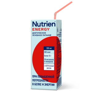 Nutrien Energy (Нутриэн Энергия) 200 мл — полноценный специализированный продукт для диетического лечебного (энтерального) питания для пациентов с высокими потребностями в белке и энергии при различных заболеваниях, включая критические состояния. Для профилактики и устранения недостаточности питания, а также коррекции состава рациона питания.Жидкая готовая смесь с нейтральным вкусом объемом 200 мл в упаковке Tetra Pak, в комплекте с одноразовой трубочкой. Ключевые особенности:• Повышенное содержание белка и энергии.• Жиры состоят на 50% из среднецепочечных трилицеридов, что способствует быстрому усвоению энергии, даже в условиях ферментативной недостаточности (отсутствие или дефицит липазы). • Белки представлены нативным молочным белком, который легко усваивается и обладает высокой биологической ценностью и биодоступностью. • Оптимальное соотношение ПНЖК (Омега 6, Омега 3 жирные кислоты), витаминно-минеральный комплекс обеспечивают выраженный антиоксидантный и иммуномодулирующий эффект. • Хорошая органолептика (не приторные, низкая вязкость) способствует высокой приверженности к диетотерапии. • Не содержит глютен, лактозу и холестерин в клинически значимых количествах. • Не содержит искусственных красителей и ароматизаторов.