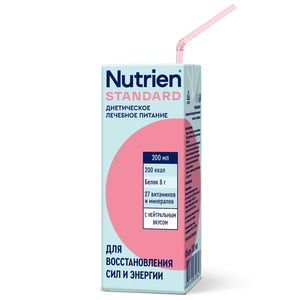 Nutrien Standard (Нутриэн Стандарт) 200 мл — полноценное диетическое лечебное (энтеральное) питание для профилактики и устранения недостаточности питания, а также коррекции рациона питания.Жидкая готовая смесь объемом 200 мл в упаковке Tetra Pak с нейтральным вкусом . К упаковке прилагается одноразовая стерильная трубочка.Три вкуса: • клубника,• нейтральный,• карамель.Ключевые особенности:• Жиры состоят на 50% из среднецепочечных триглицеридов, что способствует быстрому усвоению энергии, даже в условиях ферментативной недостаточности (отсутствие или дефицит липазы). Присутствие в смеси среднецепочечных триглицеридов позволяет назначить ее в ранние сроки после операций, в том числе на желудочно-кишечном тракте, при ограниченном усвоении жиров у больных с нарушениями функции пищеварительной системы.• Белки представлены нативным молочным белком, который легко усваивается и обладает высокой биологической ценностью и биодоступностью.• Оптимальное соотношение ПНЖК (Омега 6, Омега 3 жирные кислоты), витаминно-минеральный комплекс обеспечивают выраженный антиоксидантный и иммуномодулирующий эффект.• Хорошая органолептика (не приторные, низкая вязкость) способствует высокой приверженности к диетотерапии.• Не содержит глютен, лактозу и холестерин в клинически значимых количествах.• Не содержит искусственных красителей и ароматизаторов.