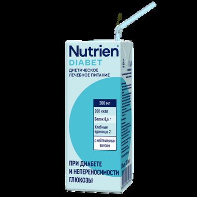 полноценное диетическое лечебное (энтеральное) питание при сахарном диабете 1 и 2 типа для поддержания нормального уровня сахара крови на всех этапах лечения и реабилитации. Может быть назначен пациентам с проблемами ЖКТ для нормализации микробиоты и моторики кишечника. Гликемический индекс 18,7. Ключевые особенности: • Углеводы (фруктоза+мальтоза) не вызывают быстрого и резкого повышения уровня глюкозы в крови, фруктоза не требует инсулин для усвоения. Низкий уровень сахаров обеспечивает низкий гликемический индекс. Профилактирует повышение сахара в крови. • Пищевые волокна нормализуют процесс пищеварения, обладают пребиотическим действием, замедляют скорость всасывания углеводов в пищеварительном тракте. • Белки представлены нативным молочным белком, который легко усваивается и обладает высокой биологической ценностью и биодоступностью. • Оптимальное соотношение ПНЖК (Омега 6, Омега 3 жирные кислоты), витаминно-минеральный комплекс обеспечивают выраженный антиоксидантный и иммуномодулирующий эффект. • Хорошая органолептика (не приторные, низкая вязкость) способствует высокой приверженности к диетотерапии. • Не содержит глютен, лактозу и холестерин в клинически значимых количествах. • Не содержит искусственных красителей и ароматизаторов. Форма выпуска: Жидкая готовая смесь объемом 200 мл в упаковке Tetra Pak с нейтральным вкусом. К упаковке прилагается одноразовая трубочка.